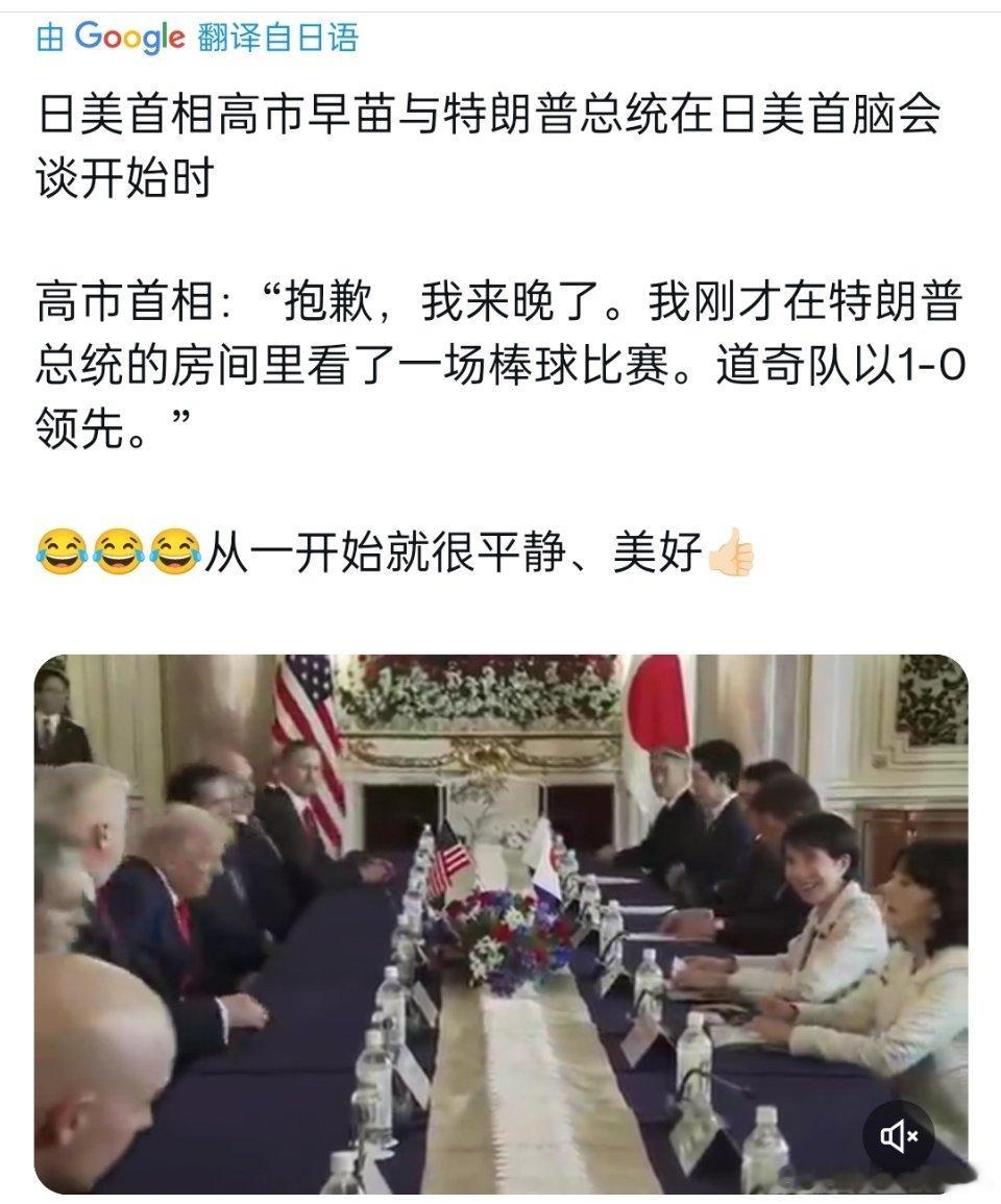 🔻美国日本会议开始前,高市早苗姗姗来迟:“抱歉,我来晚了。我刚才在特朗普的房间里看了一场棒球比赛。道奇队以1-0领先。”