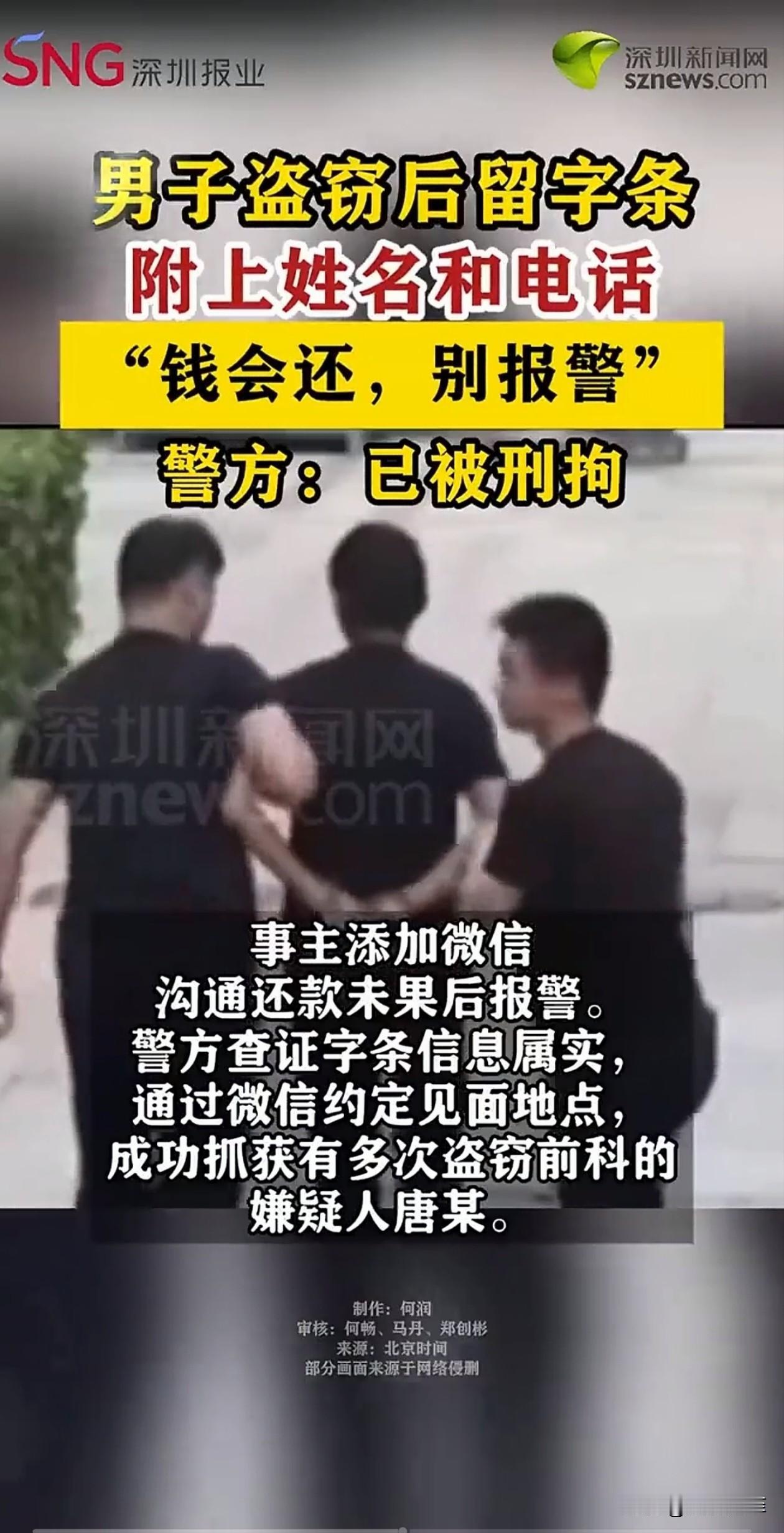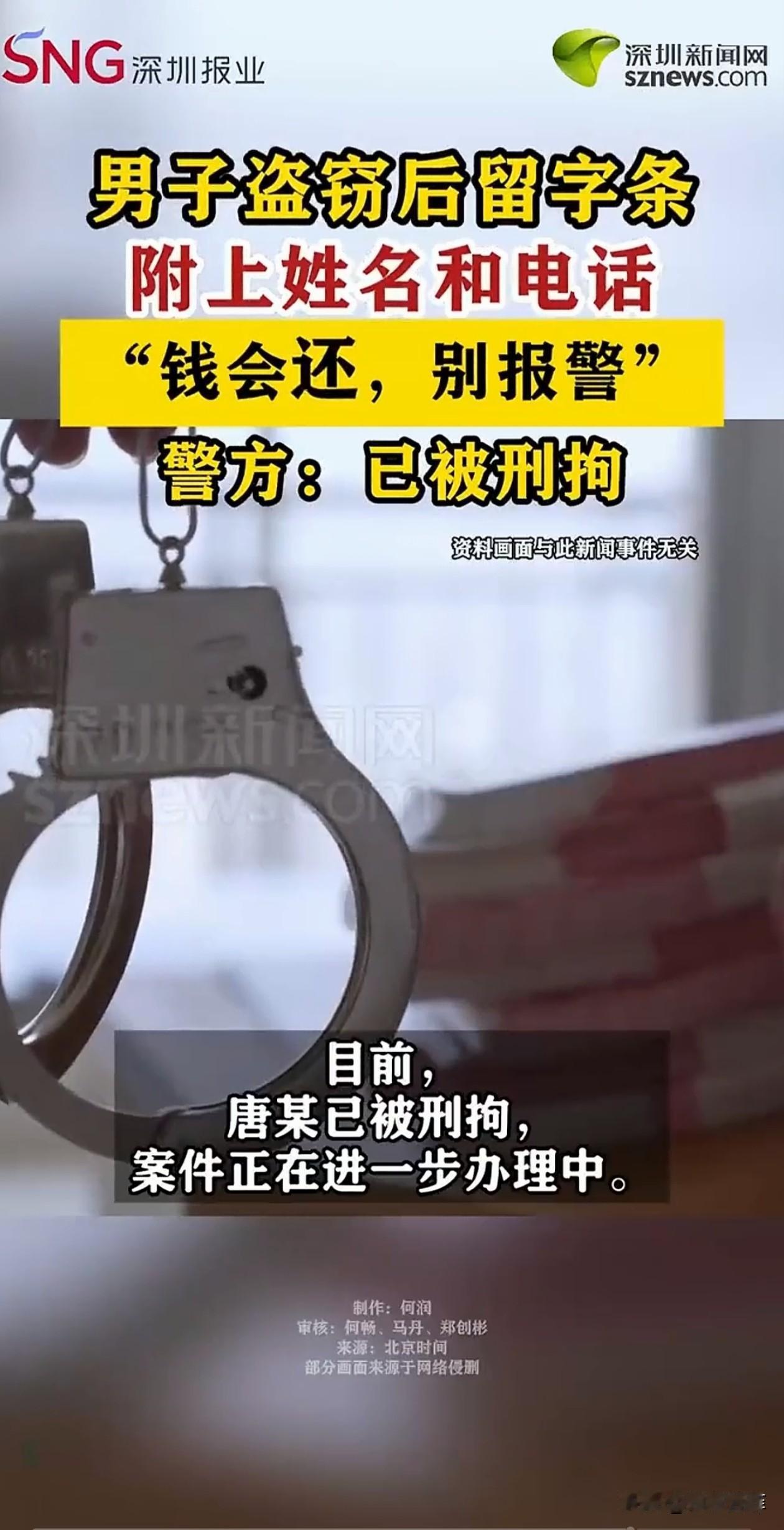 男子偷走几千元现金后,留下纸条,上面写着,别报警,会还钱,还留下了联系方式,失主加上他联系方式后却一直拖着不还。失主:太离谱了。 安徽,一市民去办公室,发现自己放着的几千块现金不见了,现场还留了一张纸条,上面写着,千万别报警,因网贷需要银行流水才偷钱,等放款了就还钱。 上面还有男子的名字和手机号,他让失主加他微信聊还钱的事。 失主虽然觉得奇怪,但想着能拿回钱就行,就加上了男子微信,催他还钱。男子虽然嘴上答应得好好的,却一直拖着不还,后来消息也不回。 失主没办法,报了警。警方一开始还以为是恶作剧或者障眼法,结果一查,纸条上的名字和手机号全是真的。 后来警方就假装是失主,通过微信跟男子聊天,并把他约出来见面,等男子一到,警方当场就把他抓住了。 原来,男子没正经工作,之前就因为盗窃被处理过。这次他是想偷点钱存进自己银行卡,制造“有流水”的假象,骗网贷平台放款。 他以为只要事后把钱还了,失主不报警,自己就没事。可没想到网贷没借到,偷来的钱也被他很快花光了。 现在男子已经被拘留了,等着他的肯定是法律的制裁。 男子自作聪明留纸条,承诺还款,以为能蒙混过关,结果还是把自己坑进去了。