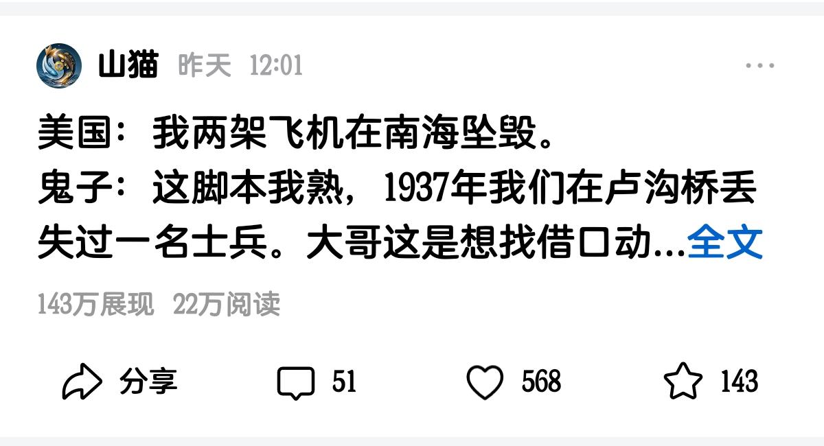 美国:我两架飞机在南海坠毁。 鬼子:这脚本我熟,1937年我们在卢沟桥丢失过一名