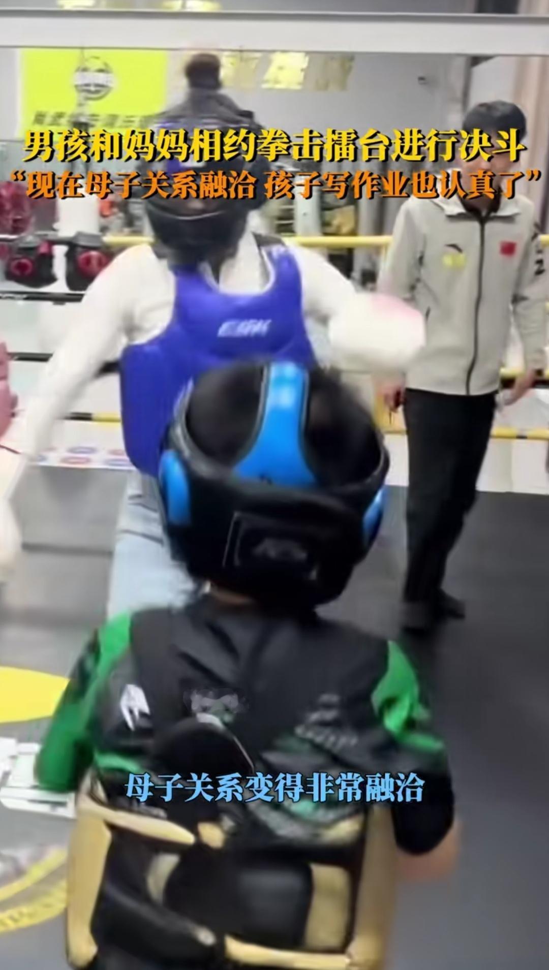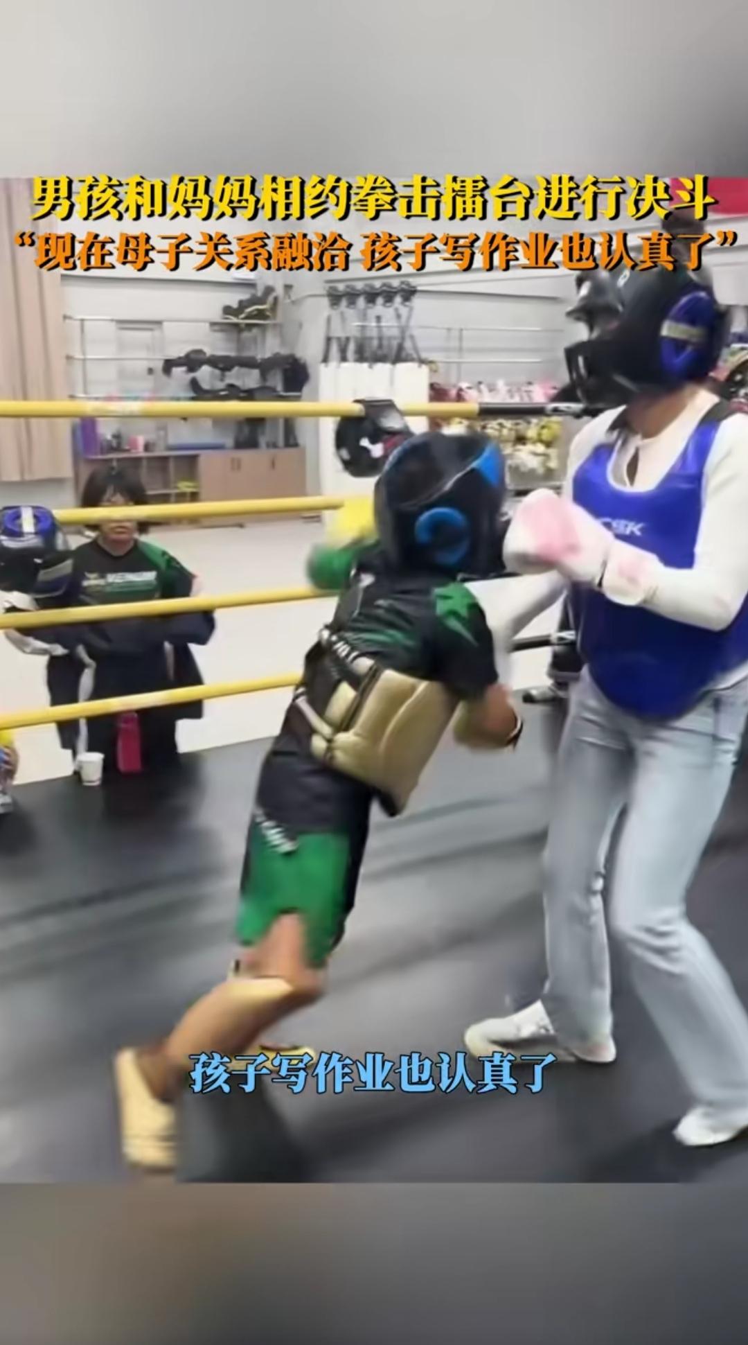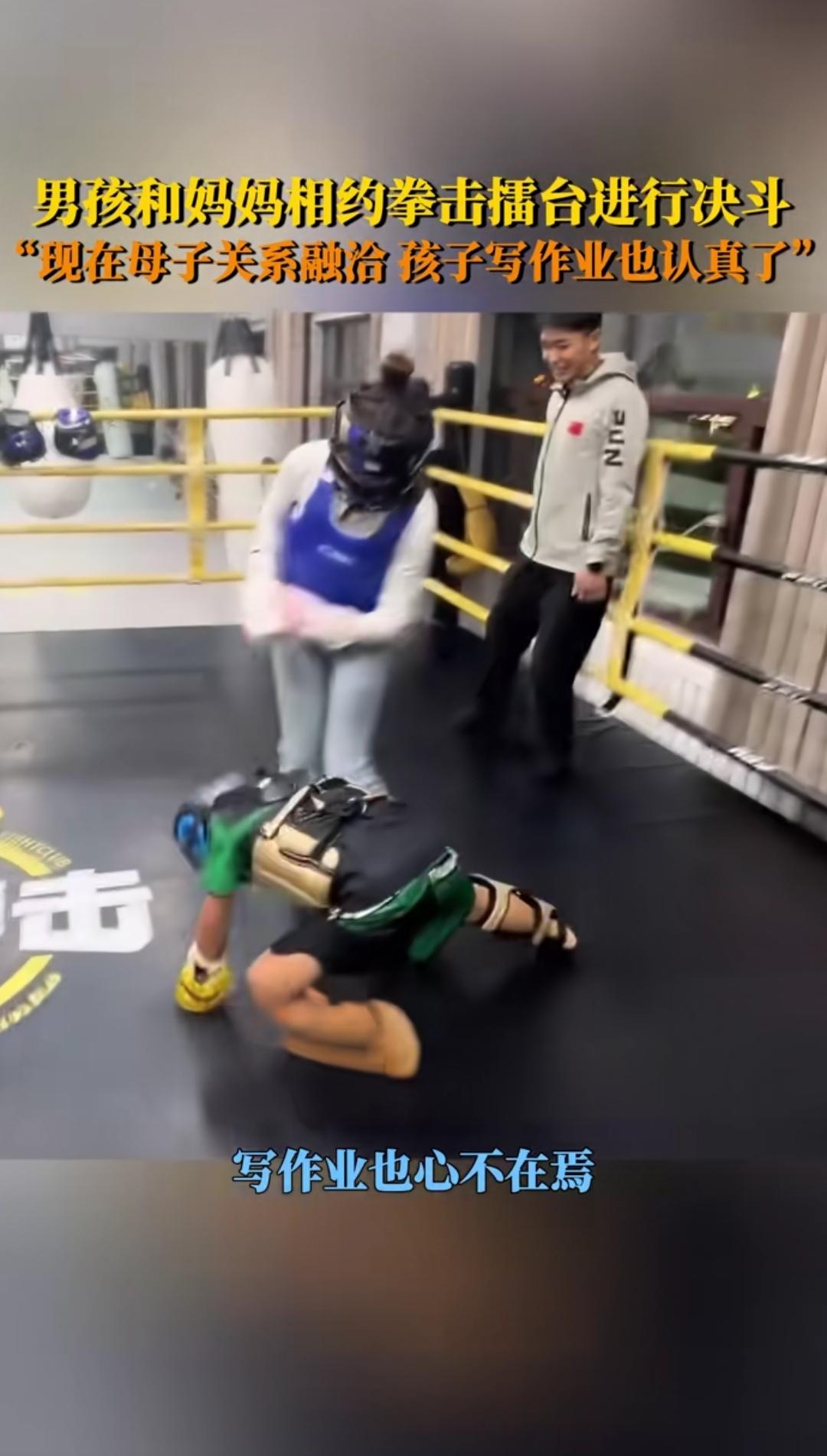 拳台之上的“亲子约定” 男孩攥紧拳套,和妈妈站在简易拳台两端——两人约定,拳