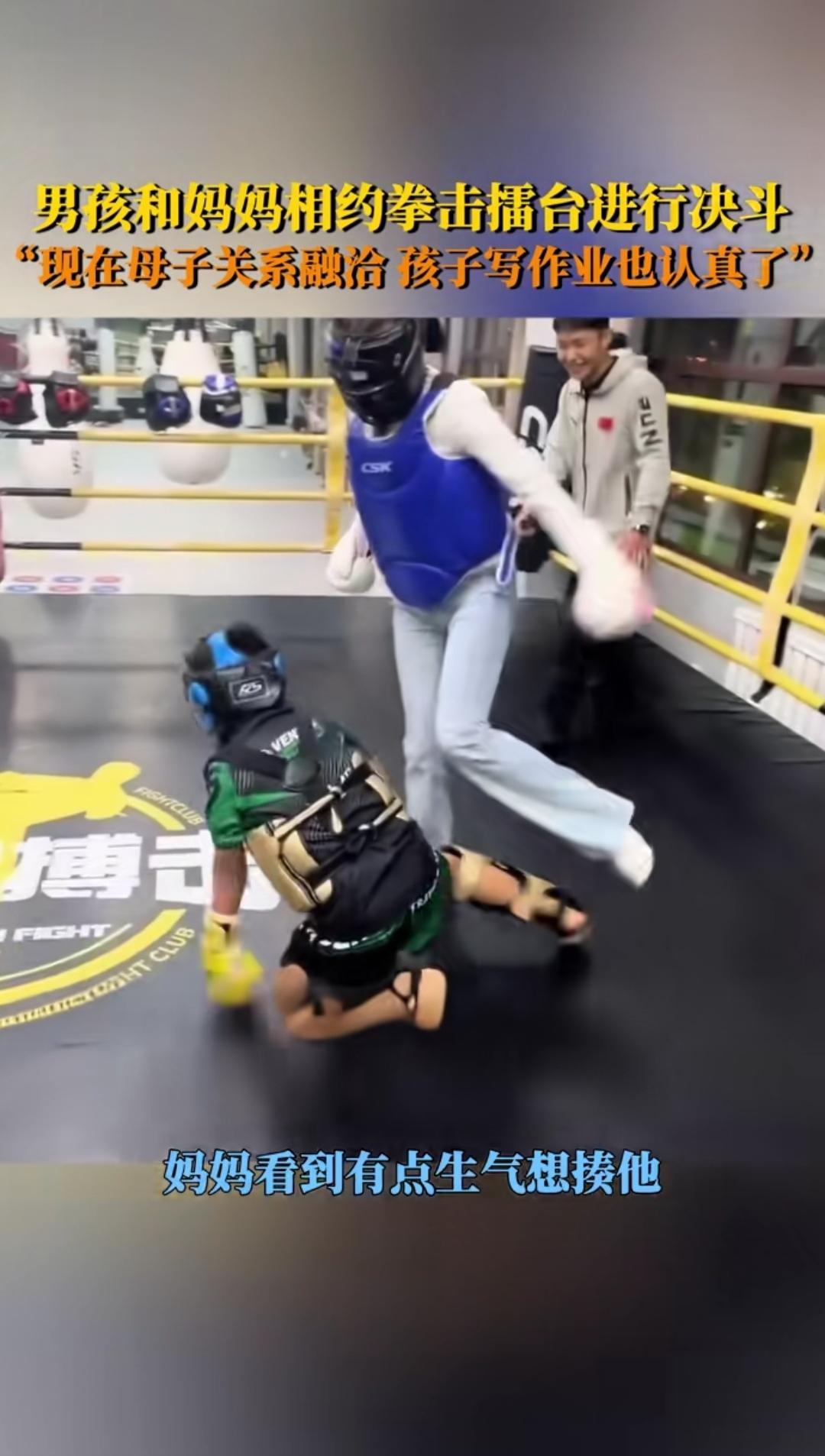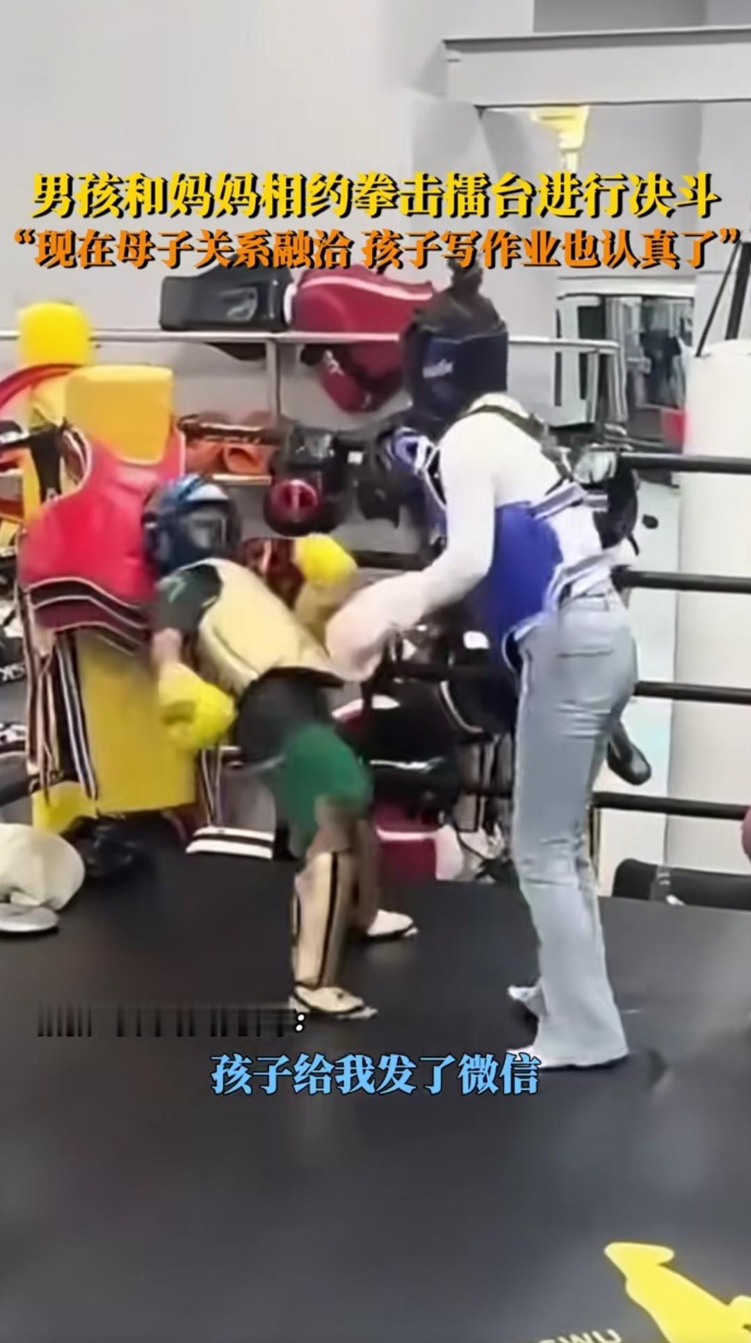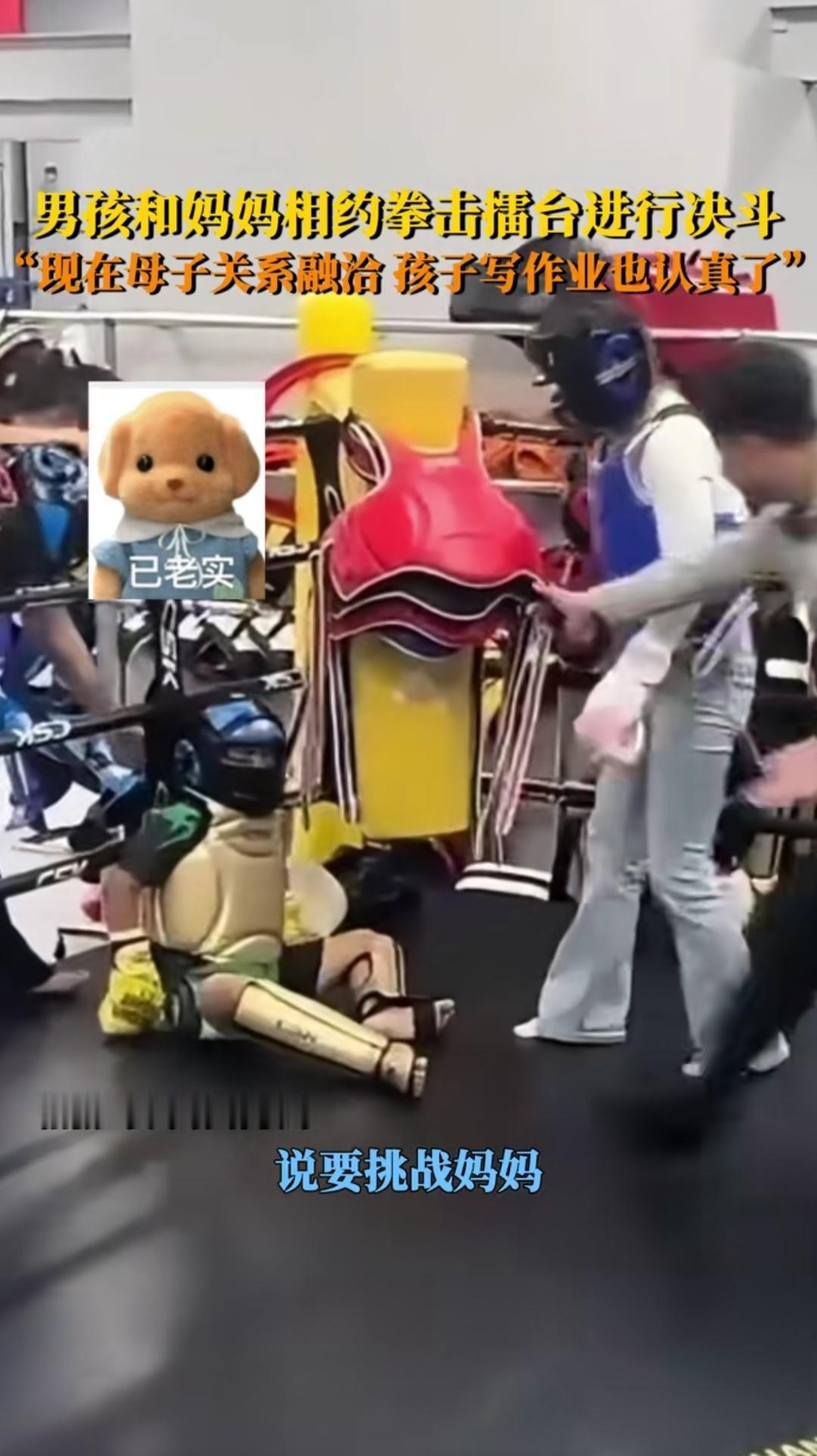 拳台之上的“亲子约定” 男孩攥紧拳套,和妈妈站在简易拳台两端——两人约定,拳
