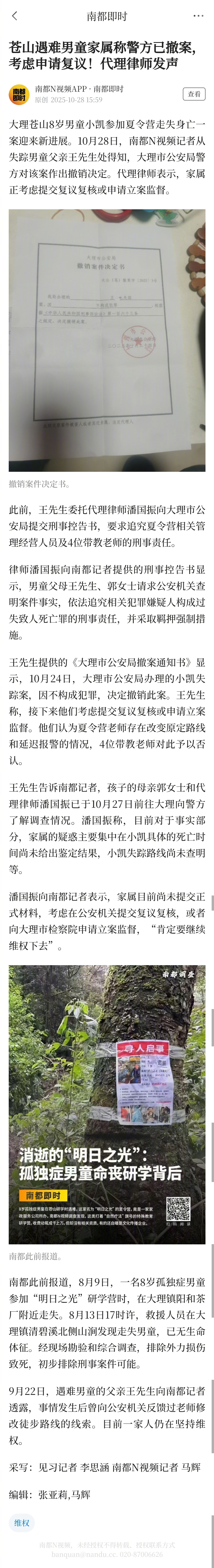 #苍山男童遇难不构成犯罪已撤案#【苍山遇难男童家属称警方已撤案,考虑申请复议!代理律师发声】#苍山遇难男童家属称考虑申请复议#大理苍山8岁男童小凯参加夏令营走失身亡一案迎来新进展。10月28日,南都N视频记者从失踪男童父亲王先生处得知,大理市公安局警方对该案作出撤销决定。代理律师表示,家属正考虑提交复议复核或申请立案监督。