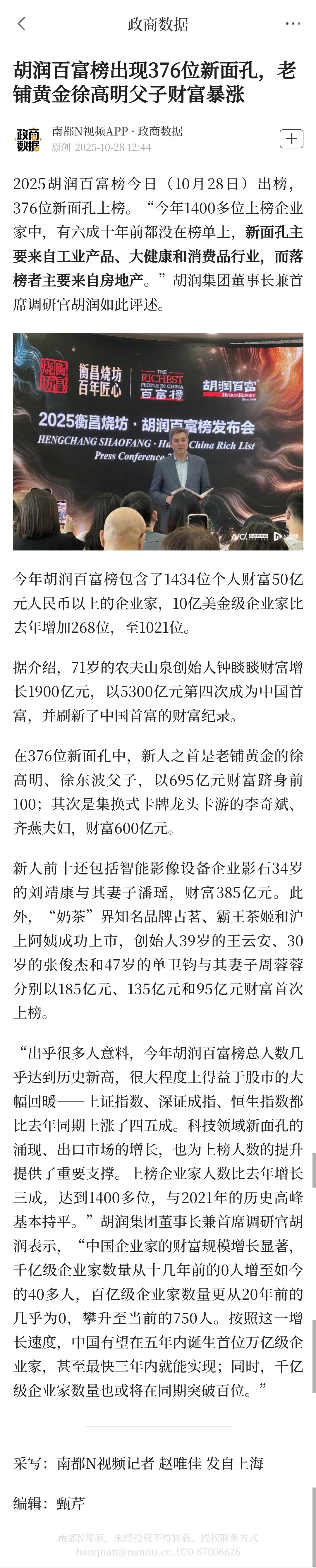 【#胡润百富榜出现376位新面孔#,老铺黄金徐高明父子财富暴涨】#钟睒睒第四次成为中国首富#2025胡润百富榜10月28日发布,376位新面孔上榜。“今年1400多位上榜企业家中,有六成十年前都没在榜单上,新面孔主要来自工业产品、大健康和消费品行业,而落榜者主要来自房地产。”胡润集团董事长兼首席调研官胡润如此评述。