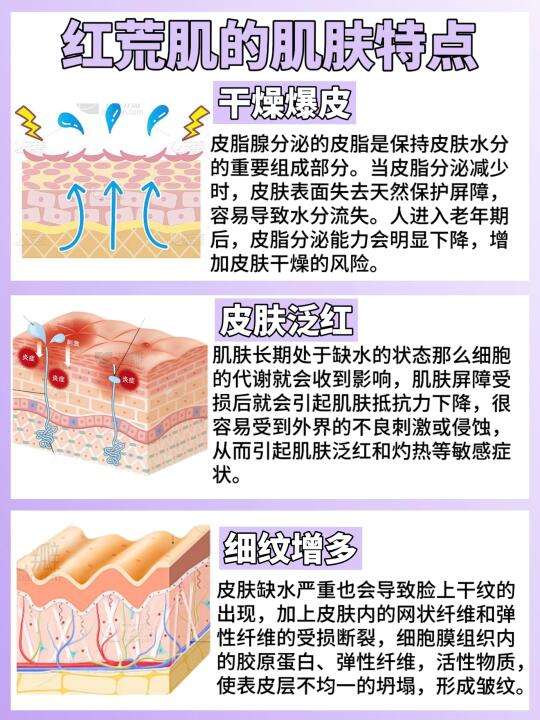 📝先科普一下“红荒肌”:就是敏感皮肤经常容易出现干燥、泛红、细纹等亚健康的表现,看上去就跟红色荒漠一样的既视感。由于干敏皮本身角质层薄,屏障功能弱,加上秋冬皮肤的水分流失加快,容易受到外界刺激引起皮肤的应激反应而泛红,同时自我修护的能力也随之下降⬇️。