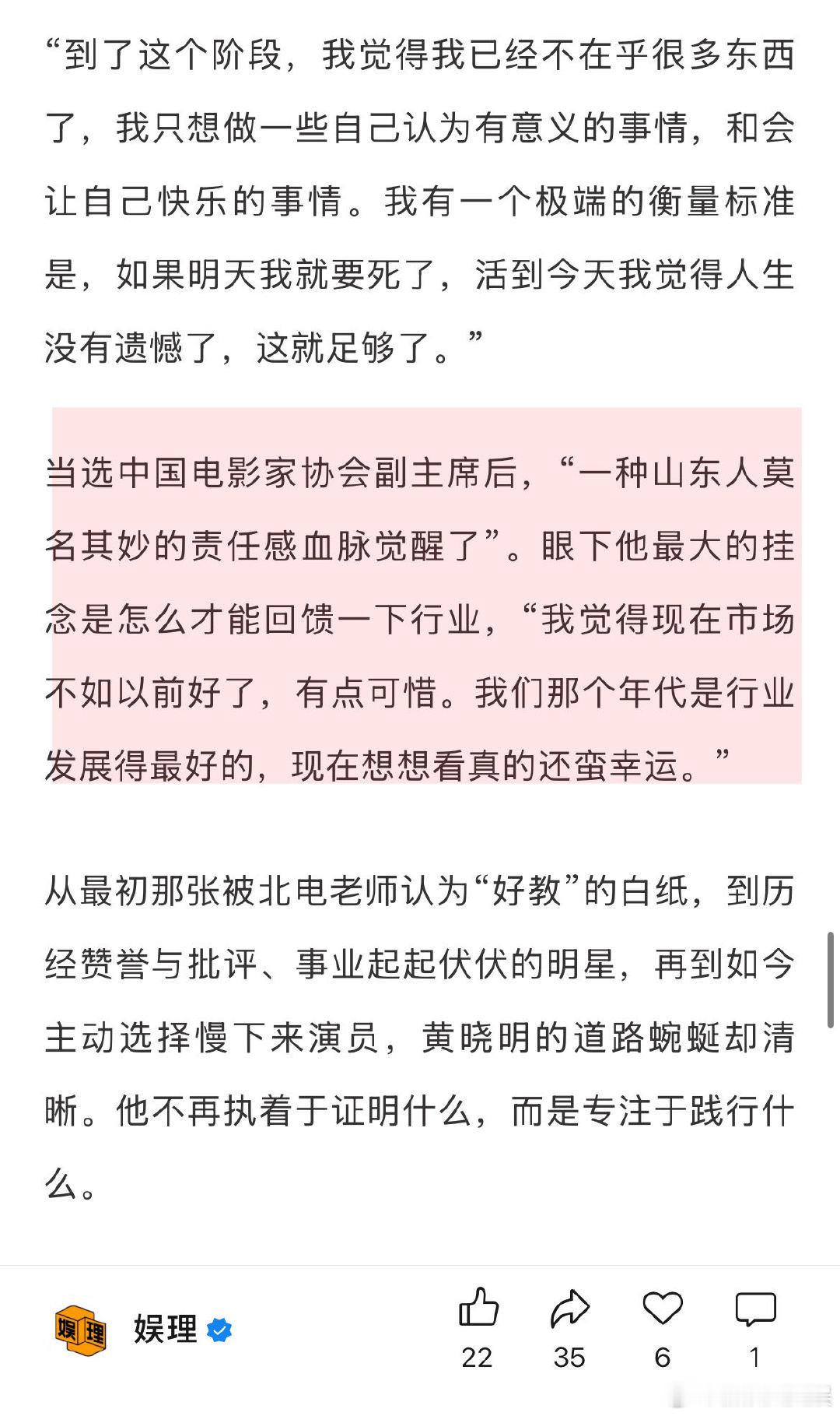 黄晓明回应三提金鸡奖影帝 黄晓明 我现在也不玻璃心了 谈及当选中国电影家协会副主席后的心情,直言:“一种山东人莫名其妙的责任感血脉觉醒了”。眼下他最大的挂念是怎么才能回馈一下行业,“我觉得现在市场不如以前好了,有点可惜。我们那个年代是行业发展得最好的,现在想想看真的还蛮幸运。” 娱理独家↓