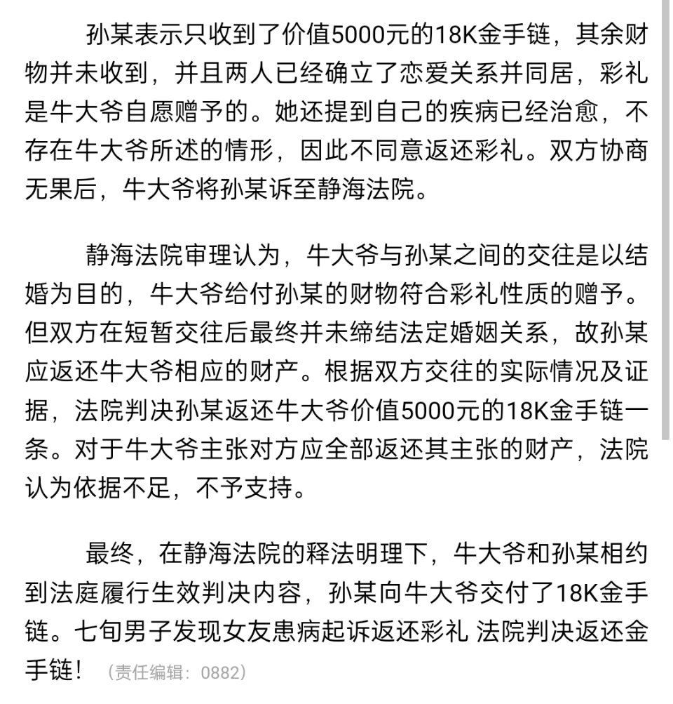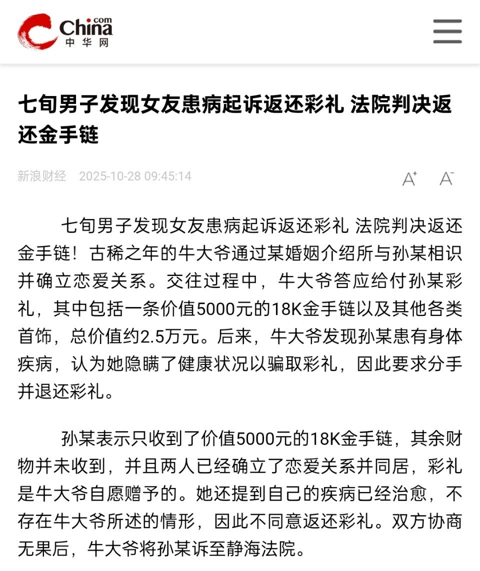 🔻很明显的春秋笔法,并不是男方发现女方患病要求退彩礼。这样写,看起来好像是男方抛弃了患病的女友一样。