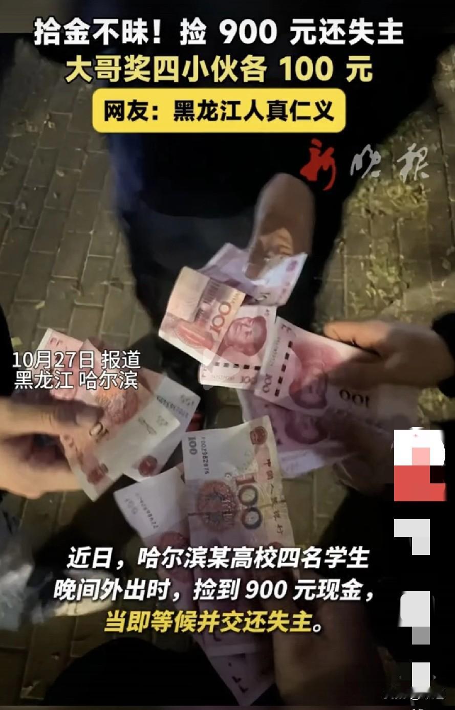 好样儿的,都是好样儿的! 近日,哈尔滨某高校四名男生外出,走着走着,忽然发现地上有钱,捡起来一查正好900元。 捡到钱了,四个人都很高兴,但转念一想。 我们高兴了,丢钱的人呢? 于是四人商议,这钱咱们不能要,于是就站在原地等失主。 没想到,一位大哥真就回来找钱了。 大哥发现四名小帅哥正在等他回来,感动坏了。 你们拾金不昧的品德太金贵了,比金钱都重啊。 当即拿出400块来,一人奖励一百,不要都不行,不要,哈尔滨大哥真急眼呐。 这事儿被媒体报道后,网友直夸这四名大学生真是好样儿的。 更给哈尔滨大哥夸的不要不要的,顺带黑龙江省都夸了,黑龙江人真讲义气!