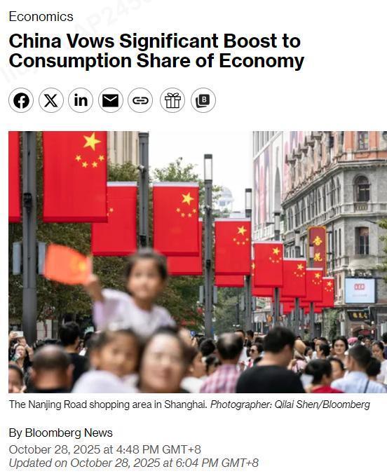 外媒:中国承诺在未来五年内显著提高消费在经济中的比重,同时继续把科技和制造业作为首要发展领域,以减少对贸易的依赖。 这一目标是在上周中国举行的四中全会公报中提出的。 公报指出,中国将形成一个更多由内需主导、以消费为动力的经济发展模式。意味着未来经济增长将更多依靠内需拉动而非出口。这一举措显示中国正在调整增长结构,推动消费成为经济的重要引擎,同时保持技术创新和制造业的领先地位。