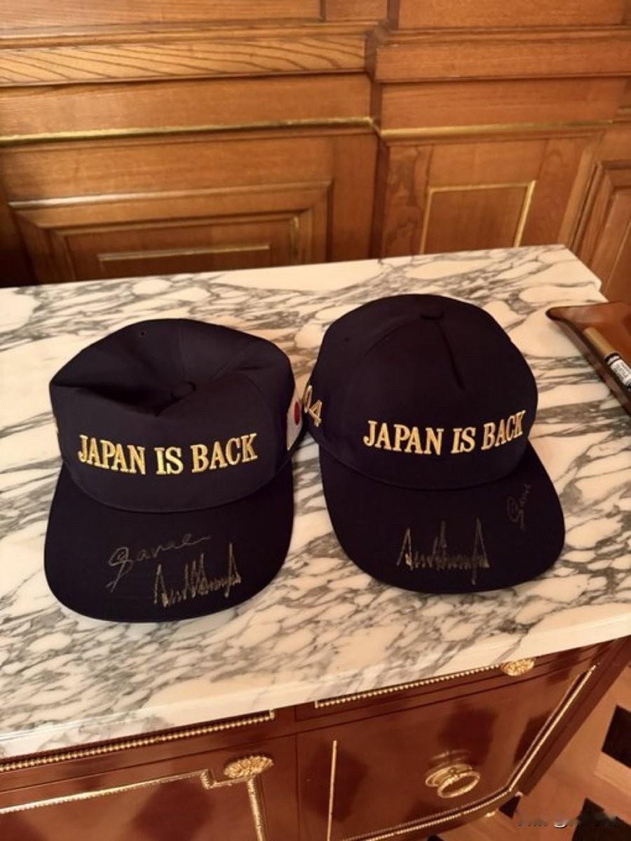 这一次,轮到日美关系「上不封顶」了。川普在赤坂迎宾舘,留下签名款球帽「JAPAN IS BACK」。 印有“JAPAN IS BACK”字样的帽子是日本首相高市早苗赠送给美国总统唐纳德·特朗普的礼物。 这些帽子是高市早苗首相和特朗普总统在2025年10月的一次日美首脑会谈后共同签署的。 帽子上的口号: “JAPAN IS BACK”(日本回来了)是前首相安倍晋三首次使用的口号,后被高市早苗在其竞选活动中沿用。 除了这些帽子,高市首相还向特朗普赠送了其他礼物,其中包括安倍晋三生前使用的推杆,以及高尔夫球手松山英树签名的球包。这些礼物旨在效仿安倍和特朗普通过高尔夫建立的亲密关系,以加强日美联盟。