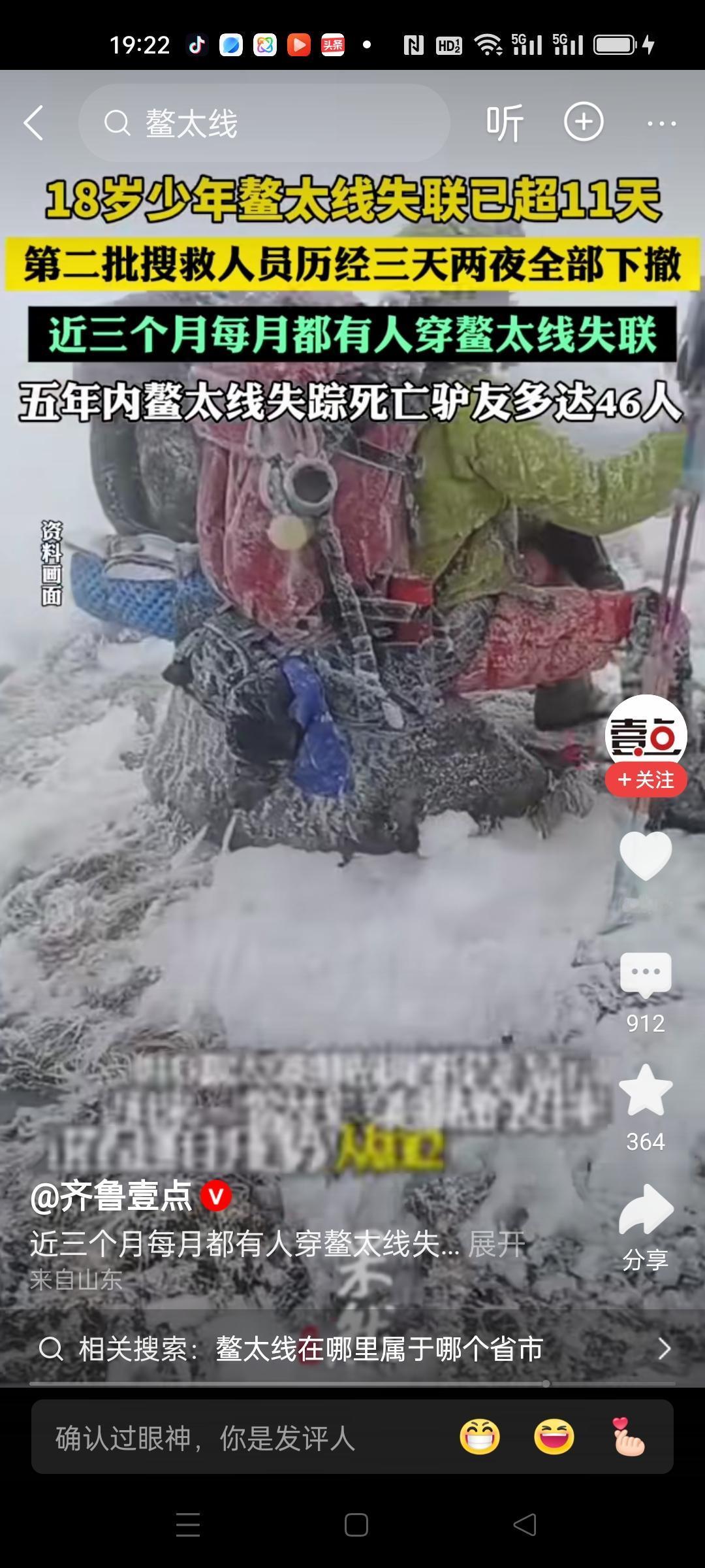 鳌太线是要拿生命去挑战的,五年内在此路线失踪死亡驴友多达46人! 现在又有湖南18岁小伙失联超11天,性命堪忧。目前第二批搜救队员已经下撤。这条路线山高路险,水源稀少,全程走完需要5-7天。而且气候多变,刮风下雪能达到零下十几度。 没有充足食物补给,没有好的身体着装抵抗严寒,失温,饥饿,饥渴,迷路都会丧命。 驴友们,别去了,敬畏大自然,生命不是儿戏!