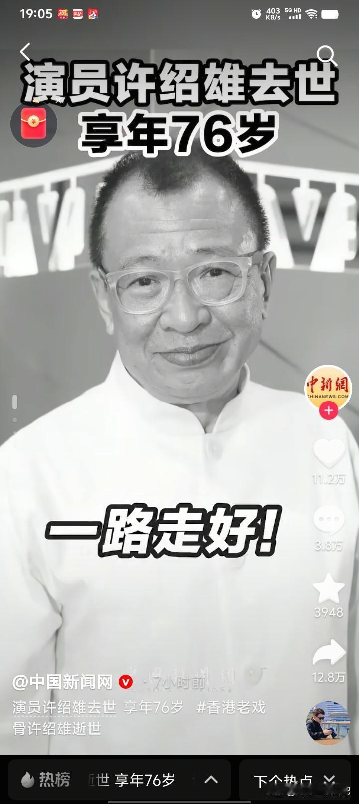 痛心!“欢喜哥”许绍雄走了,这才是演艺圈最该有的样子 刚刷到许绍雄离世的消息,心里咯噔一下,那个演活了无数配角的“金牌绿叶”真的离开了。76岁,因癌症器官衰竭走的,临终前好多明星都赶去探望,佘诗曼还哭着说他像父亲。 出身多显赫啊,鲁迅是姑爷爷,家世背景能甩圈里人几条街,可他偏要当几十年配角。从《射雕》的朱聪到《使徒行者》的欢喜哥,近300部作品,每个小人物都让人记一辈子。他说“角色无大小,演好就够了”,76岁还有新剧没播,是真的爱演戏。 现在多少人急着抢主角、炒热度,许绍雄却用一辈子证明,配角也能活成传奇。他的离开不只是少了个好演员,更像一个港剧黄金时代的缩影在褪色。 你印象最深的是他哪个角色?来聊聊那些年他陪我们追过的剧吧!