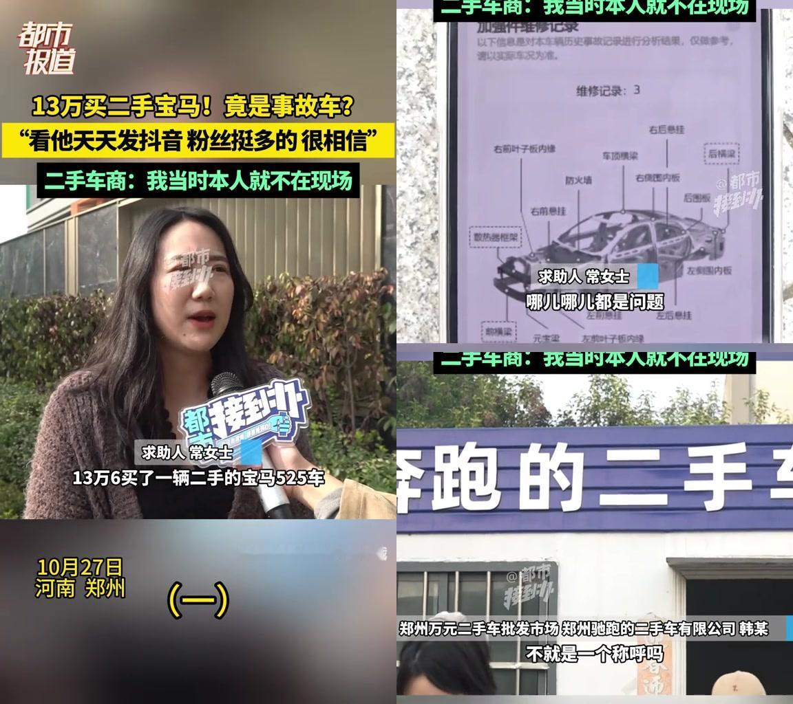 13.6万买的“无事故”宝马,掀开引擎盖我腿都软了! 郑州常女士说,看车商天天发抖音、粉丝过万,就信了他“无事故无水泡”的保证,结果买回家一查,是撞过梁头的大事故车! 车商倒好,一句“我当时不在现场”就想甩锅,之前拍胸脯“粉丝包过户”的劲儿哪去了? 有人说“粉丝多的商家要脸,不会坑人”,也有人骂“13年宝马最多值6万,这是把人当冤种宰”,还有人喊“必须退一赔三,不能惯着这种嘴炮”。 我真是气坏了,粉丝得靠攒,可不能用来消费信任的啊!我们愿意信粉丝多的善意,可有些商家偏要拿信任当韭菜割! 大家有没有过因为对方粉丝多就轻信的坑?大家怎么看?