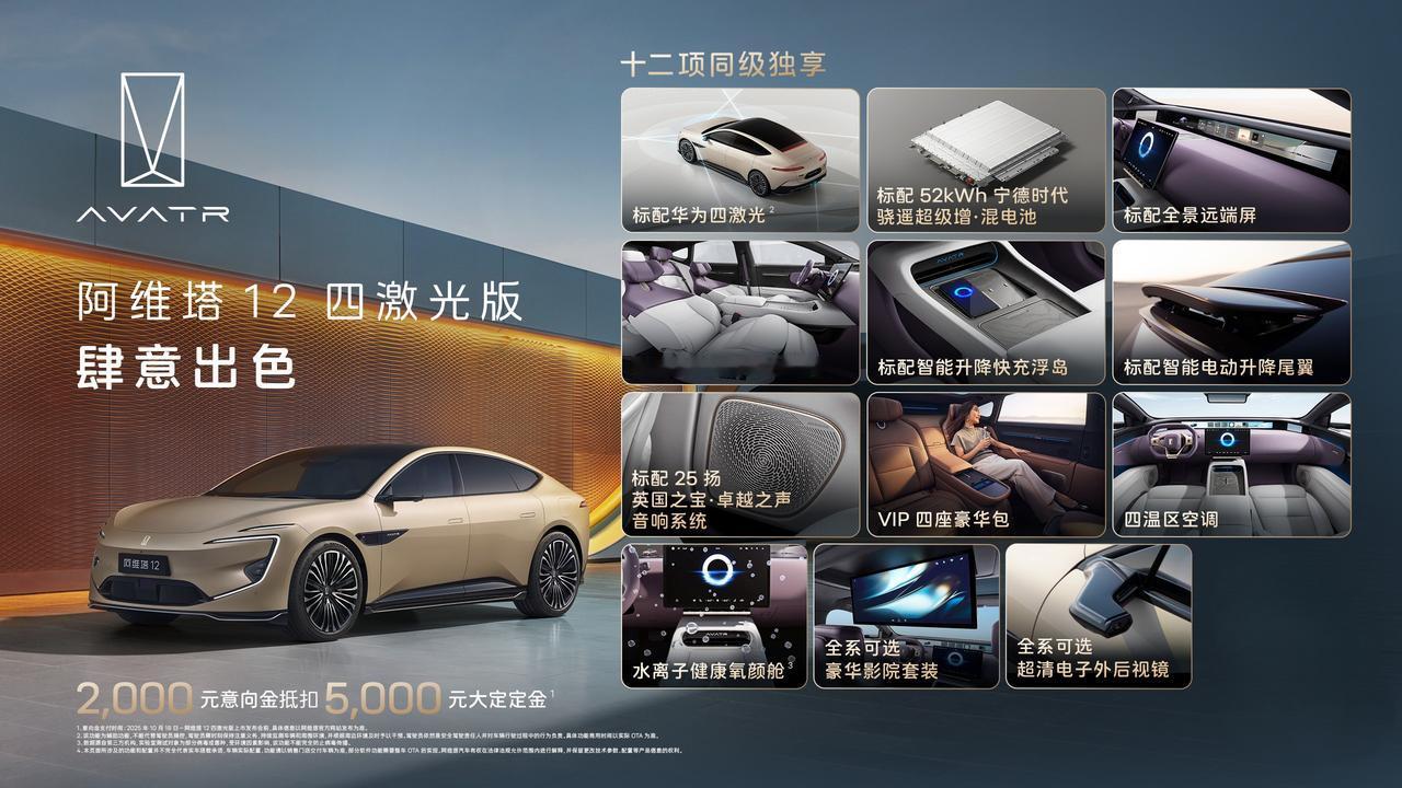 当设计遇见智能,会迸发出怎样的火花?阿维塔12四激光版给出了答案。10月28日,新车正式上市,以“智美新豪华”理念,将未来出行体验带入现实。 其核心在于全系标配华为乾崑智驾ADS 4,实现智能辅助驾驶的全面进化。系统采用WEWA世界模型架构,决策更类人、更流畅,重刹率降低70%,通行效率提升20%。车位到车位2.0支持跨城通勤“0干预”,智能识别ETC通道,长途出行如履平地。全维防碰撞CAS 4.0守护车内外安全,应对“鬼探头”等极端场景。 四颗激光雷达(3长距+1后向固态)实现360°无死角覆盖,150米远距探测精准捕捉障碍物。即便在暴雨大雾天气,系统仍能稳定工作。鸿蒙座舱HarmonySpace 5支持iOS无缝投屏、声纹识别与多维主题生态,座舱即个性秀场。阿维塔12四激光版,正以科技与美学的深度融合,为用户带来高效、安心且富有仪式感的出行新体验。四激光版阿维塔12全系标配华为乾崑ADS 4