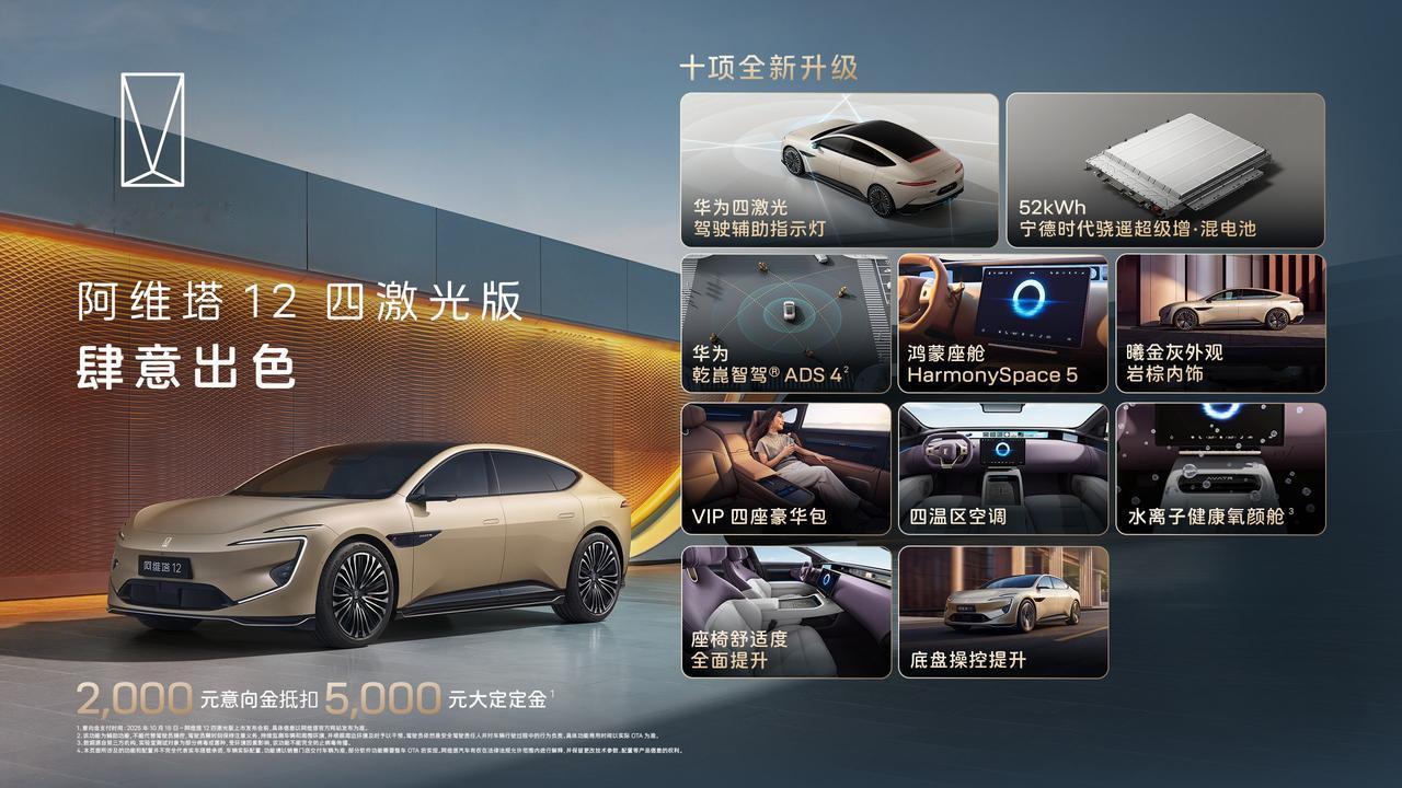 当科技融入生活,智能座舱就不再只是“工具”。阿维塔12四激光版于10月28日上市,搭载鸿蒙座舱HarmonySpace 5,结合华为乾崑智驾ADS 4,打造懂用户的移动智慧空间。 鸿蒙座舱HarmonySpace 5支持iOS设备无缝投屏,苹果用户也能畅享互联乐趣。Hspace-Link技术实现平板无感配对,后排娱乐与车控更自由。系统具备声纹识别功能,可区分不同乘客并提供个性化应答。千悟建议主动提醒进隧道切换内循环,光随影动让氛围灯随影音内容动态变色,山海画质提升影像逼真度。 与此同时,华为乾崑智驾ADS 4提供车位到车位2.0、全维防碰撞CAS 4.0等核心功能,确保驾驶安全高效。四颗激光雷达360°覆盖,复杂城市路况游刃有余。结合VIP四座与纳米水离子空调,阿维塔12四激光版为追求品质的用户,打造集科技、舒适与安全于一体的移动生活空间,让出行更有温度。四激光版阿维塔12全系标配华为乾崑ADS 4