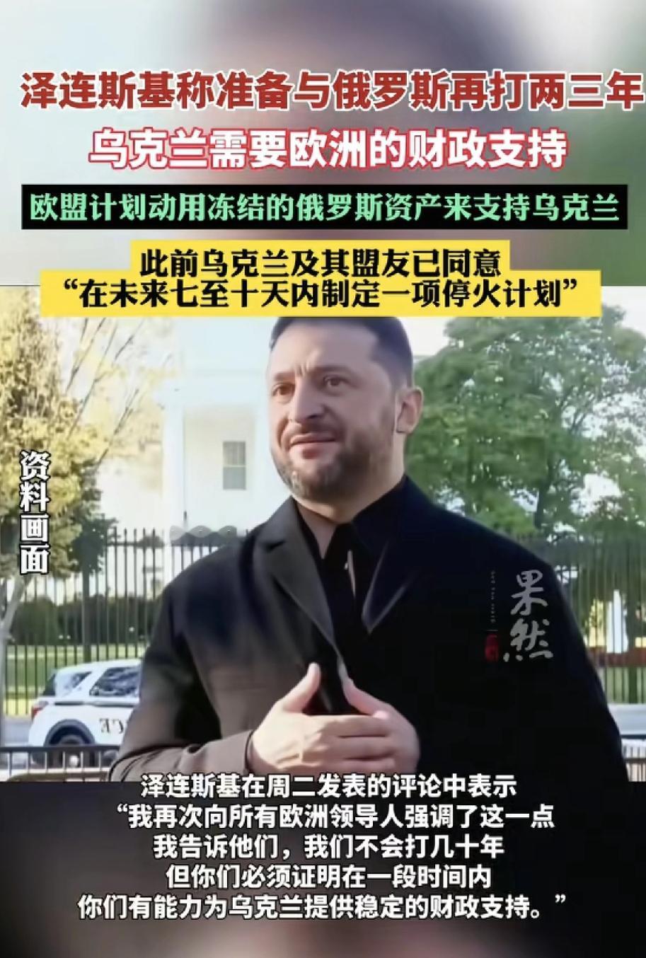 泽连斯基准备再打两三年,而老美总统任期一届4年,现在特朗普快干了一年,那三年后老美总统选举,民主党上台对于泽连斯基来说就是福音,那也就是说,这两三年在老美那里泽连斯基想得到支持可能低。 而泽连斯基转头向欧盟喊用冻结的俄罗斯资产用于战争,但他想法太美,欧洲也有不少资产在俄罗斯,同时那些资产是俄罗斯亲欧人士的比较多,到时候大家对于欧洲会认为是一个极其野蛮而不文明的国家,信誉度将毁于一旦,就为支持泽连斯基把老欧洲所有国运全部搭上,老欧洲也不傻。 猜泽连斯基想的就是欧洲支持到特兰普任期满,然后民主党上台,然后又支持他,关键民主党能上台吗?即便上台的民主党又不是拜登。