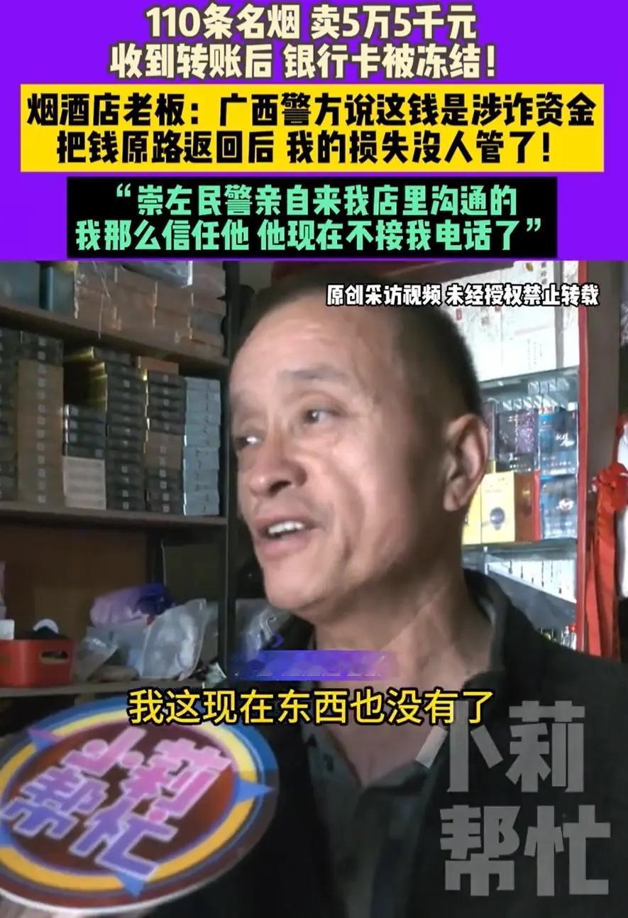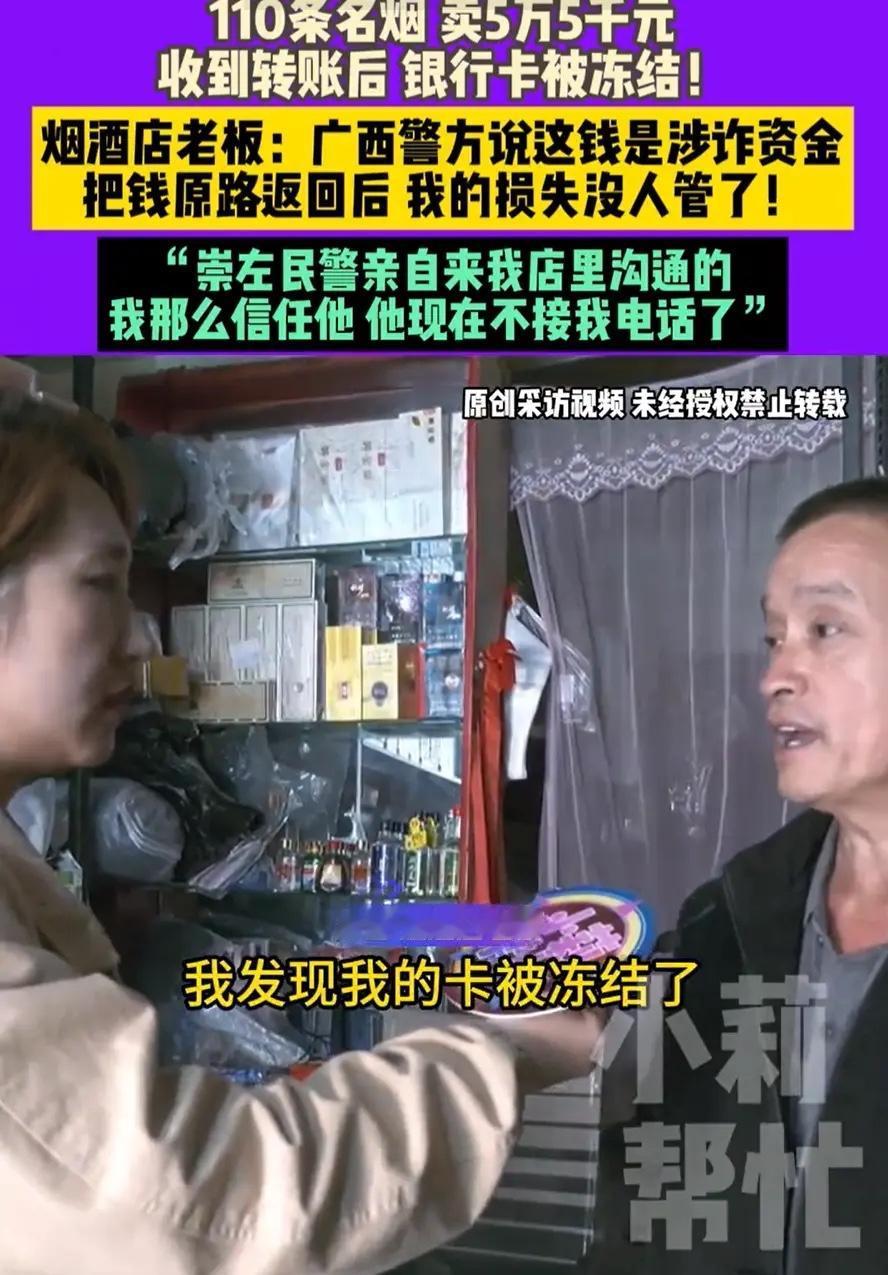 河南洛阳,一男子走进一家烟酒店,张口就要110条好烟,而且二话不说连现金带转账一下支付了55000元,老板一看还以为来了个大客户,可没过几天银行卡就被冻结了,一分钱都动不了。 银行一查,说那笔4.5万的转账涉及电信诈骗,是涉案资金。没多久,广西崇左的民警打来电话,让老板把钱原路退回,说这样才能配合结案,账户也能早点解冻,还承诺会帮忙追回那批烟。老板想着自己又没做亏心事,配合是应该的,就把钱退了回去。 结果钱一退,人就找不着了。当初留的联系方式,电话打不通,微信也不回。烟没了,钱也没了,店里的资金链直接断了。老板想报案,可人家说他不是受害人,想维权,又不知道该找谁。一时间,几万块的损失,愣是没人认账。 这事儿不是个例。最近全国多地都有类似情况,手机店、金店、烟酒店的老板,都被“大客户”盯上。对方不讲价、不砍价,动不动几万块直接转账,看着是生意上门,其实是把商户当成了“资金通道”。诈骗得来的钱,转给老板买货,货到手后立刻转卖,钱就“洗白”了。最后案破了,钱追回了,倒霉的却是那个老实收钱的店主。 有网友评论说:“我们起早贪黑挣个辛苦钱,哪知道收个款还能踩雷?” 也有网友表示:“执法要效率,可不能让守规矩的人替坏人买单。配合完就失联,这算哪门子公平?” 问题来了:普通老板没长火眼金睛,怎么分辨一笔钱是不是赃款?配合办案是义务,可义务履行完,损失谁来补?执法不能只讲结果,还得讲温度。否则,伤的不只是一个店,而是千千万万小商户的心。 别让守法的人,流了汗又流泪。