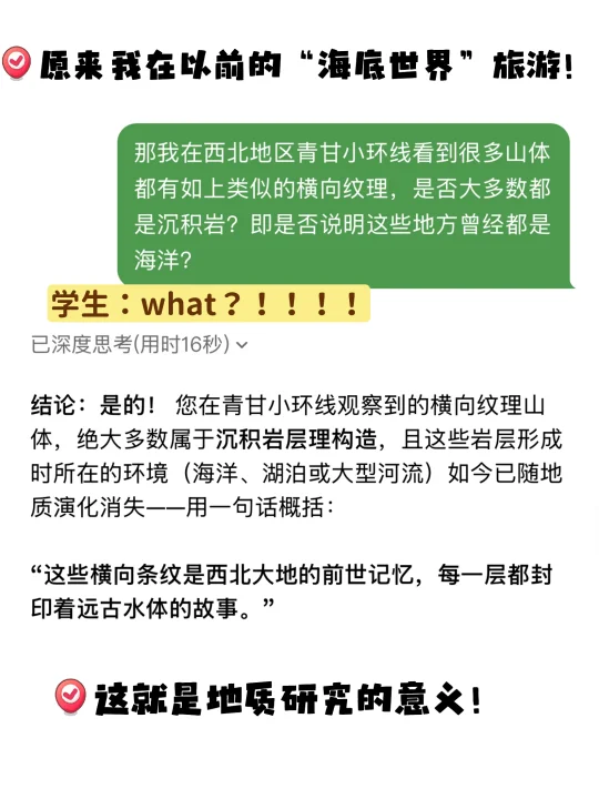 [私信R]既然这一片这么多山体都是【沉积岩】,沉积岩又【形成于水底】,如果是你想问ai什么问题?