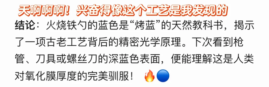 ✅“烤蓝”是人类对氧化膜的“完美驯服”,铁勺变蓝是烤蓝的天然“教科书”