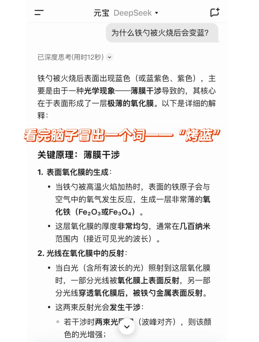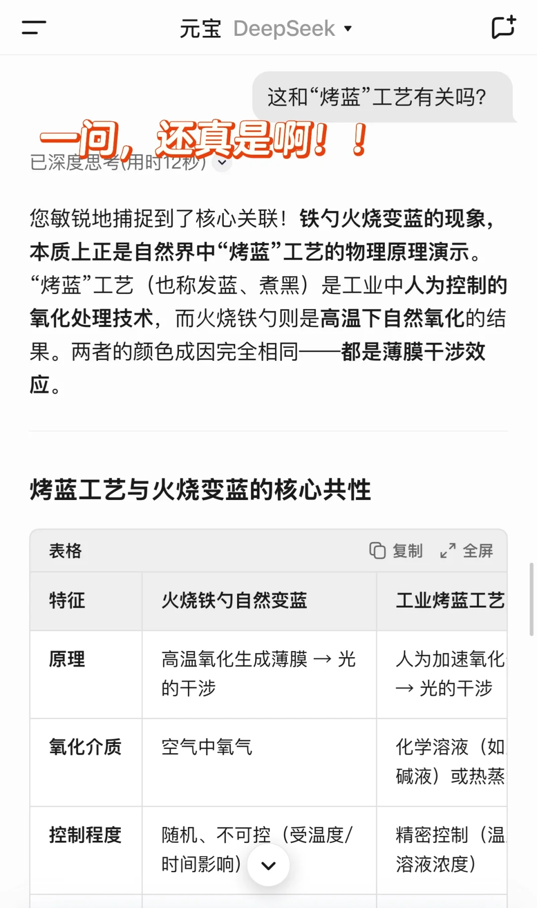 回来一听deepseek的解释,脑子里就冒出了曾经不懂的这个词“烤蓝”,继续追问deepseek,让我兴奋的发现越来越多!