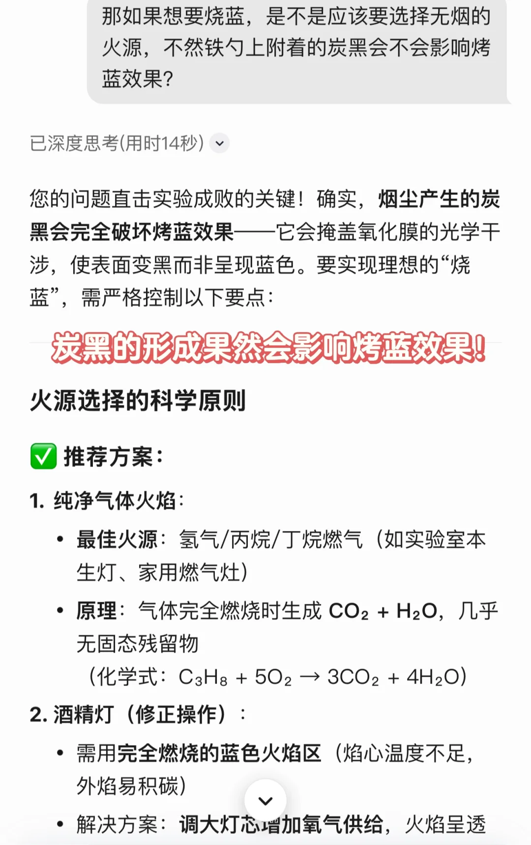 ✅【炭黑的形成会干扰“烤蓝”工艺】,所以那几个组挑选的酒精灯确实是很好的烤蓝工具!!