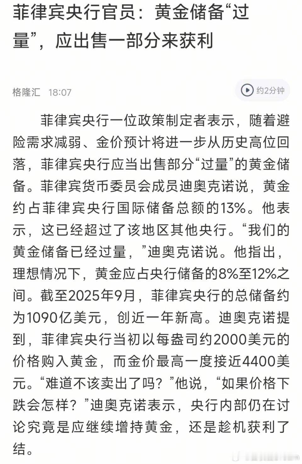 金价回调原因🔻菲律宾觉得金价太高了,准备出售一部分黄金了。最怕的是接下来有更多国家效仿这一行为。[哆啦A梦吃惊][哆啦A梦吃惊]