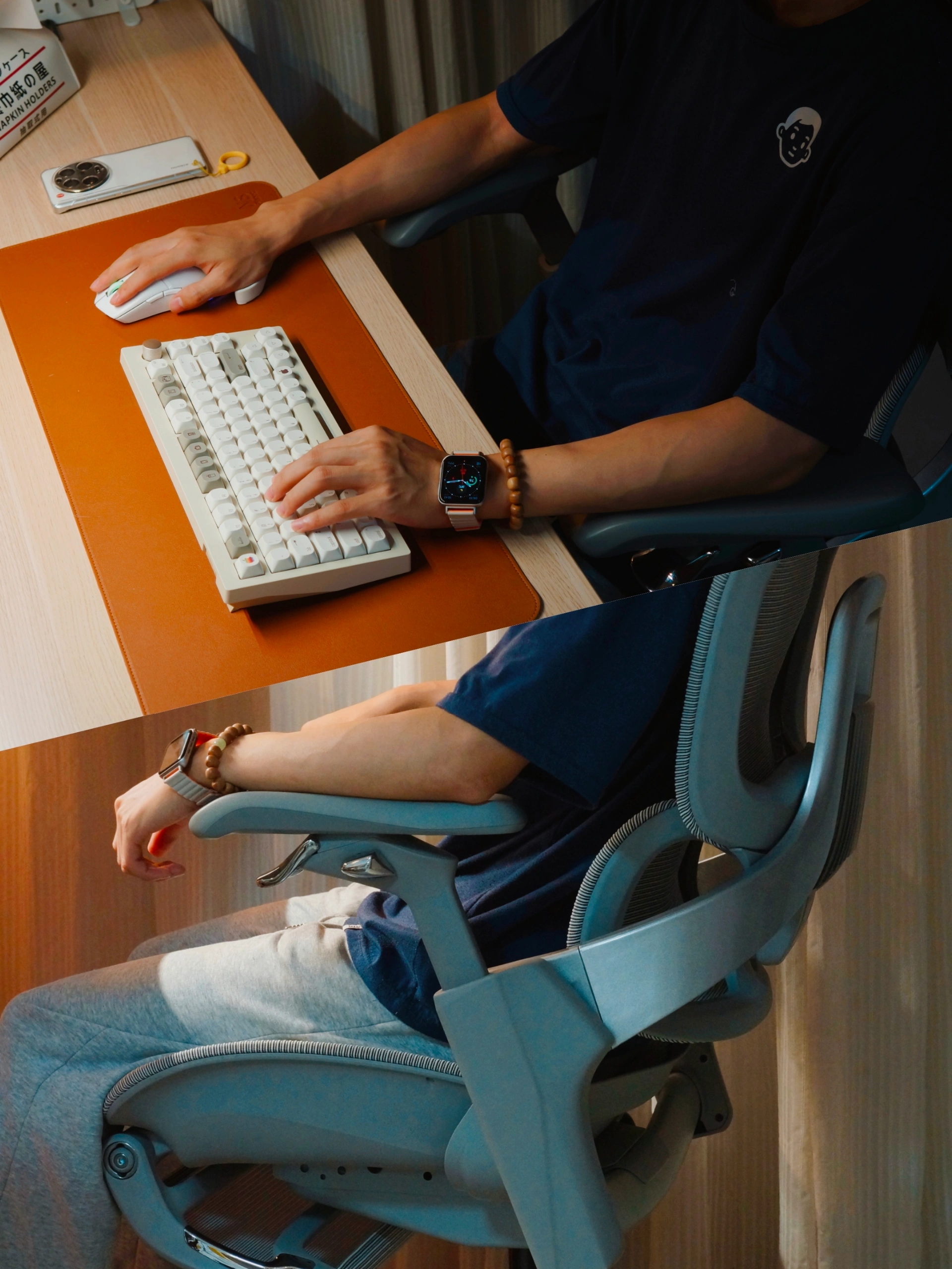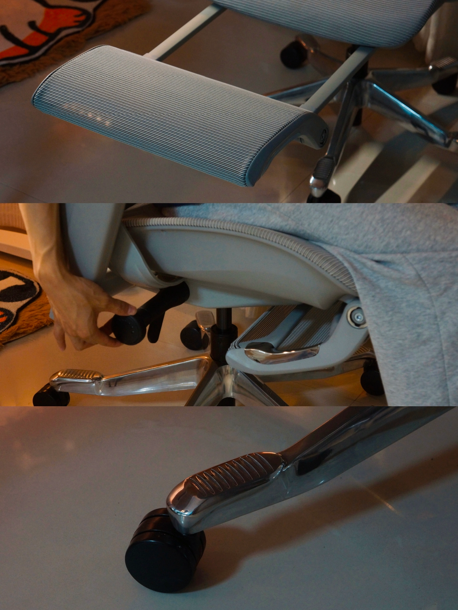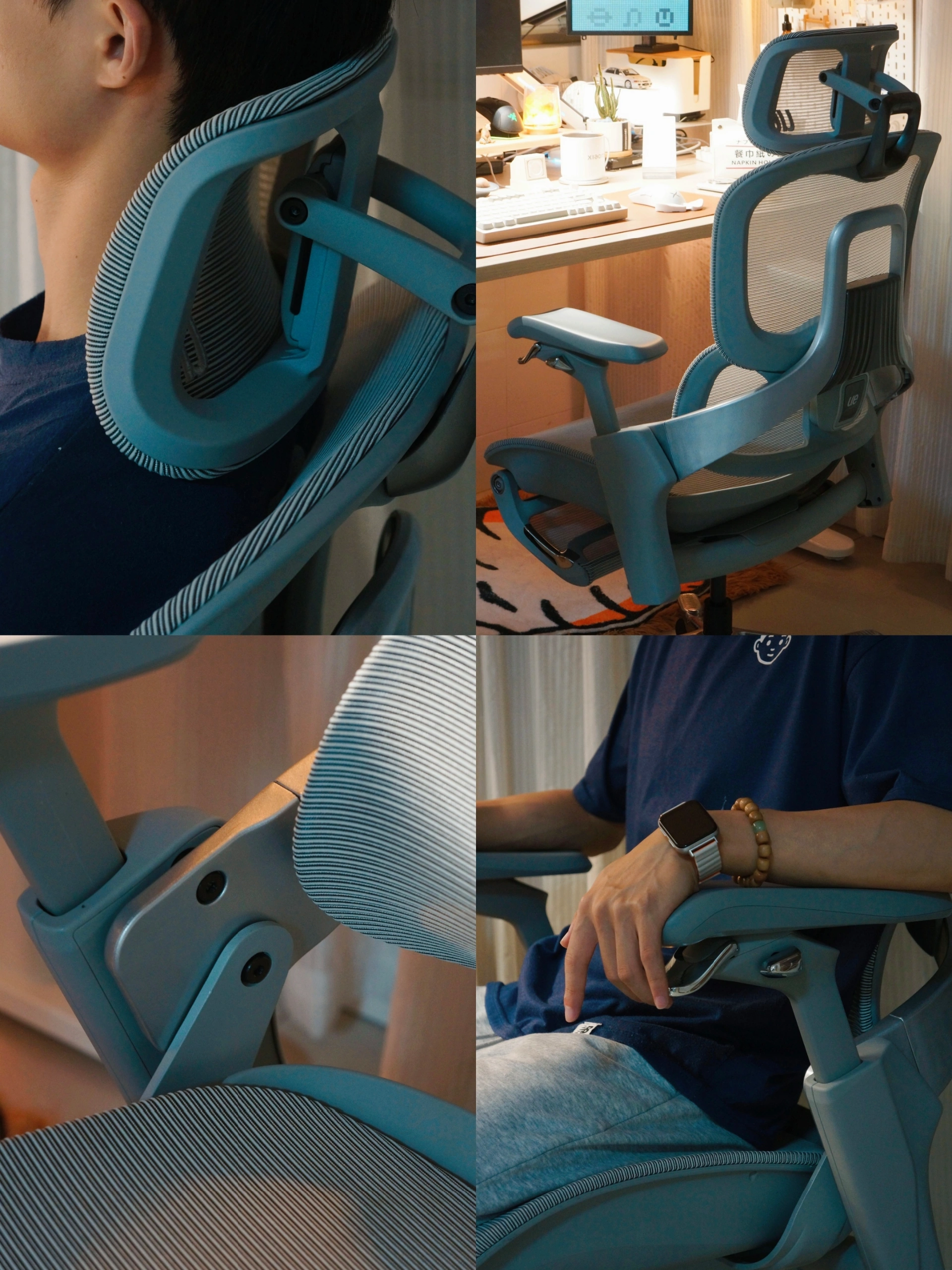 ⌨️日常发现除了键盘手托对手腕的支撑,更重要的小臂关节悬空的吃力。椅子可多角度调整线性扶手可以很好给我的手臂带来一个良好的支撑。而且平时调整椅子高低,坐垫深浅都可以随手在扶手下自然的操控到,不用像其他人体工学椅弯腰在座垫底部调节