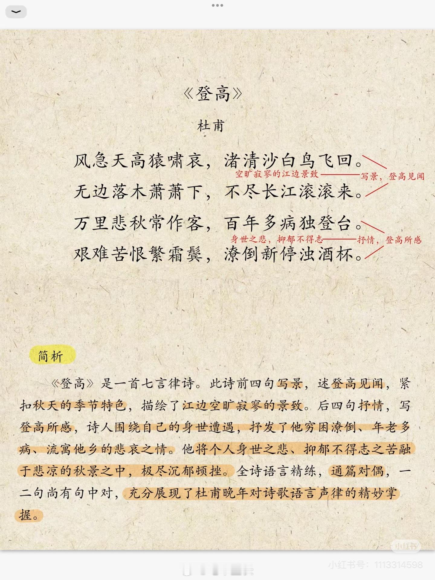 9月初9重阳,脑子里突然蹦出了《登高》,还一字不差地背出来了。带大家复习一下当年