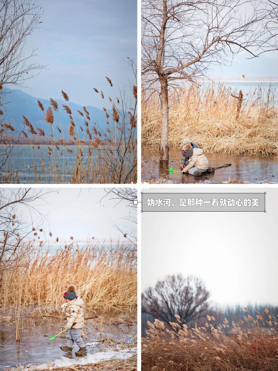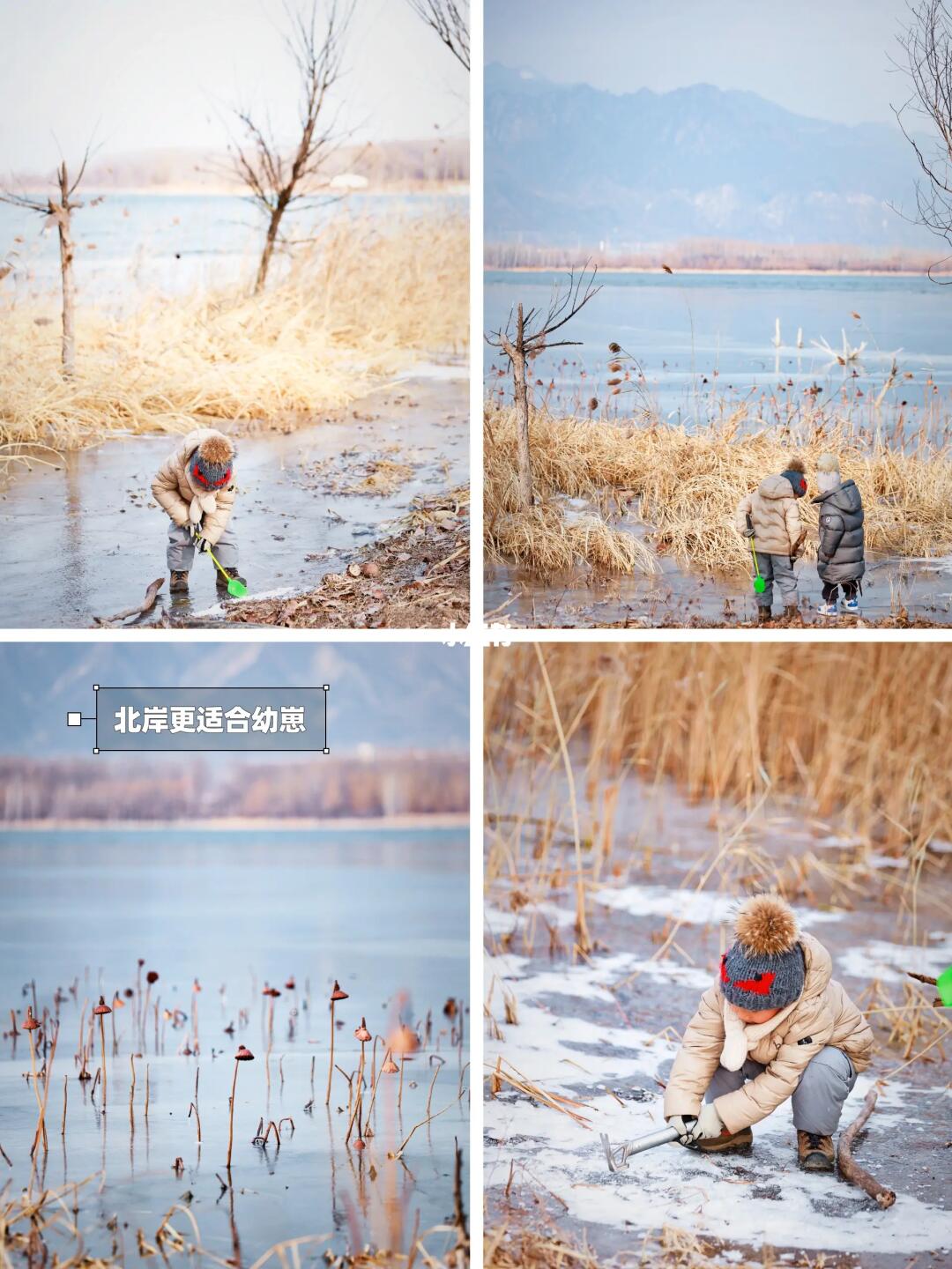 蓝白相间的冰面和远处的芦苇,还有远山和滑雪场,日落超级美好,可以去五棵树、妫水河二号桥和北岸的延下路;