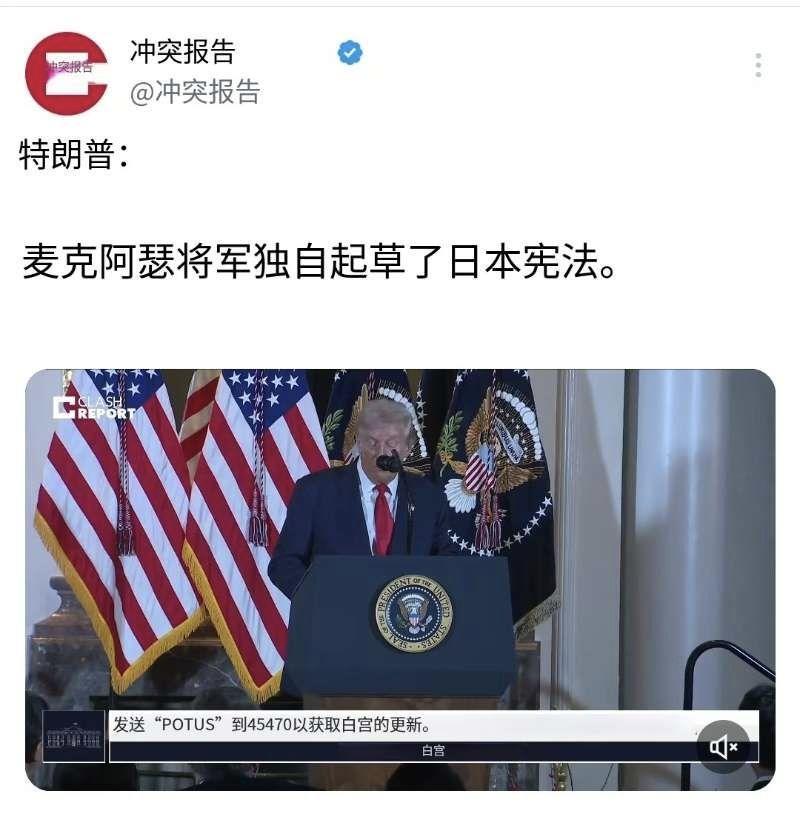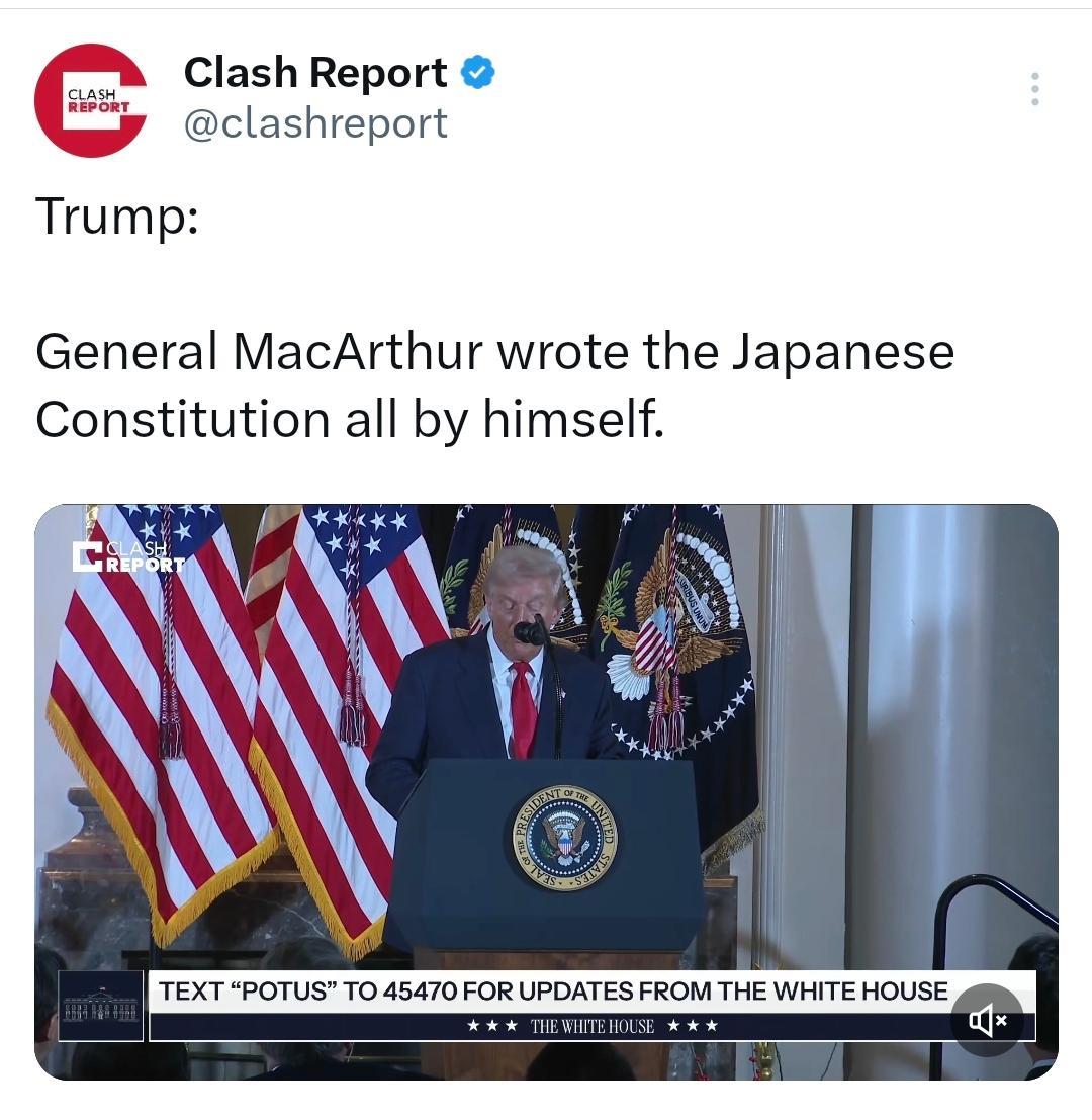 特朗普昨天(10月28日)在日本表示,当年麦克阿瑟将军独自起草了日本宪法。 [机智]评几句:特朗普此言严重失实。麦克阿瑟虽主导起草日本宪法核心原则,但其团队仅用7天完成草案框架,日本宪法最终成型依赖日本本土法律专家逐条修订。所谓“独自起草”实为美军强压下日本妥协的产物,特朗普此番吹嘘暴露其历史认知的荒诞。