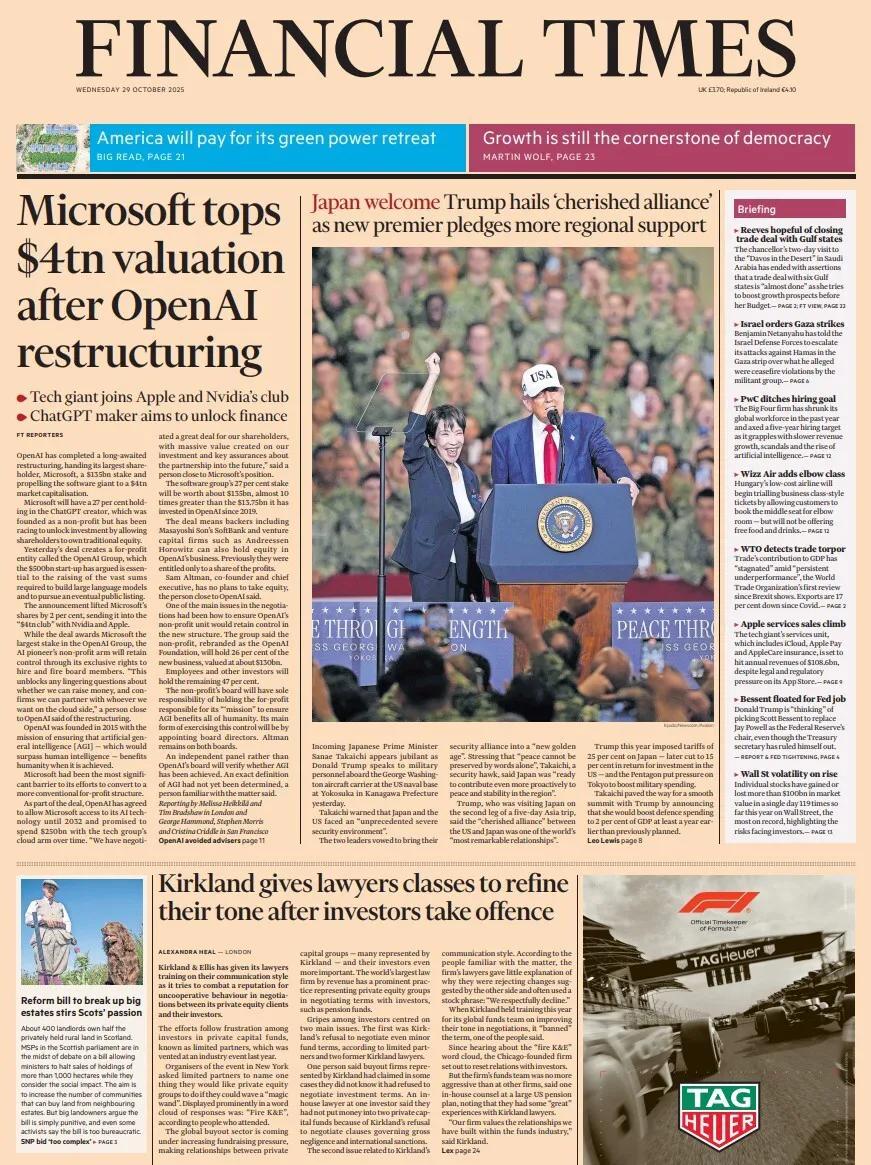 《金融时报》报道称,在微软获得ChatGPT母公司OpenAI 27%的股份后,其市值首次飙升至4万亿美元(约3万亿英镑)。
