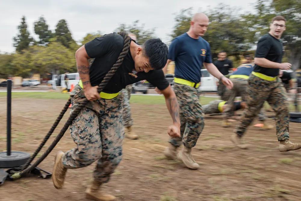 2025年10月3日,在加利福尼亚州圣地亚哥美国海军陆战队新兵训练营举行的进行动态热身。
