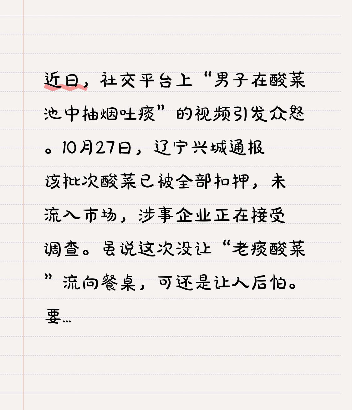 近日,社交平台上“男子在酸菜池中抽烟吐痰”的视频引发众怒。10月27日,辽宁兴城通报该批次酸菜已被全部扣押,未流入市场,涉事企业正在接受调查。 虽说这次没让“老痰酸菜”流向餐桌,可还是让人后怕。要是没有网友曝光,这批酸菜大概率就进市场了。而且谁能保证这是第一次这么“生猛”地做酸菜呢?此前又有多少“老痰酸菜”端上了餐桌?2022年“3·15”晚会就曝光过酸菜生产乱象。看来,酸菜食品安全监管得常态化,这样才能倒逼企业规范生产。