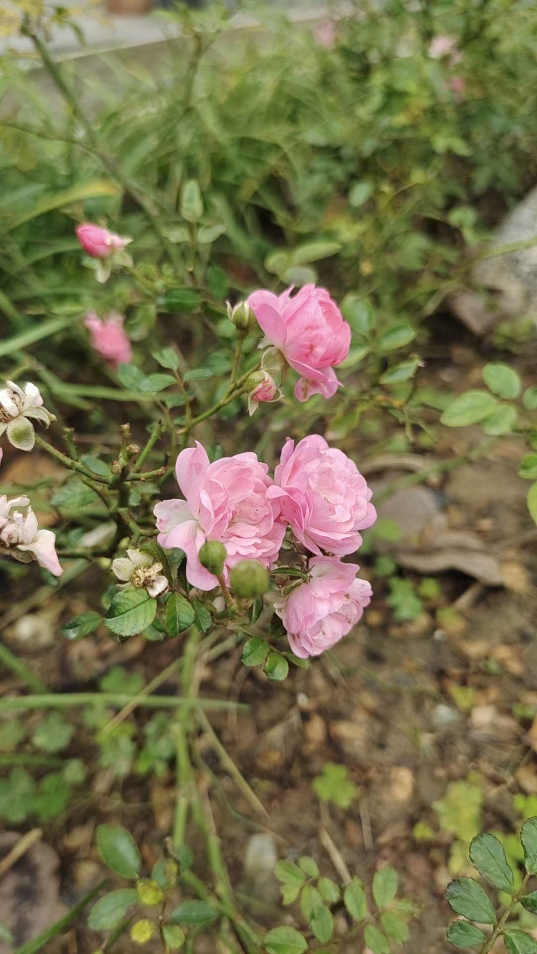 早上在路边瞧见一丛粉月季,可招人稀罕了! 几朵开得正盛的,花瓣裹得圆乎乎,粉里透点嫩白,像刚揉好的棉花糖;旁边还挂着俩花苞,粉嘟嘟地鼓着,看着过两天就能炸开。叶儿是油绿绿的小椭圆,就是沾了点土,倒更显接地气。 就是可惜有两朵开败了,蔫蔫地蜷着边儿。不过这也没啥,花开花落本来就是常事儿,眼下这满枝的粉乎乎,已经够让人心里甜滋滋的了——普通路边的小景致,也能攒出这么点小欢喜,挺好。