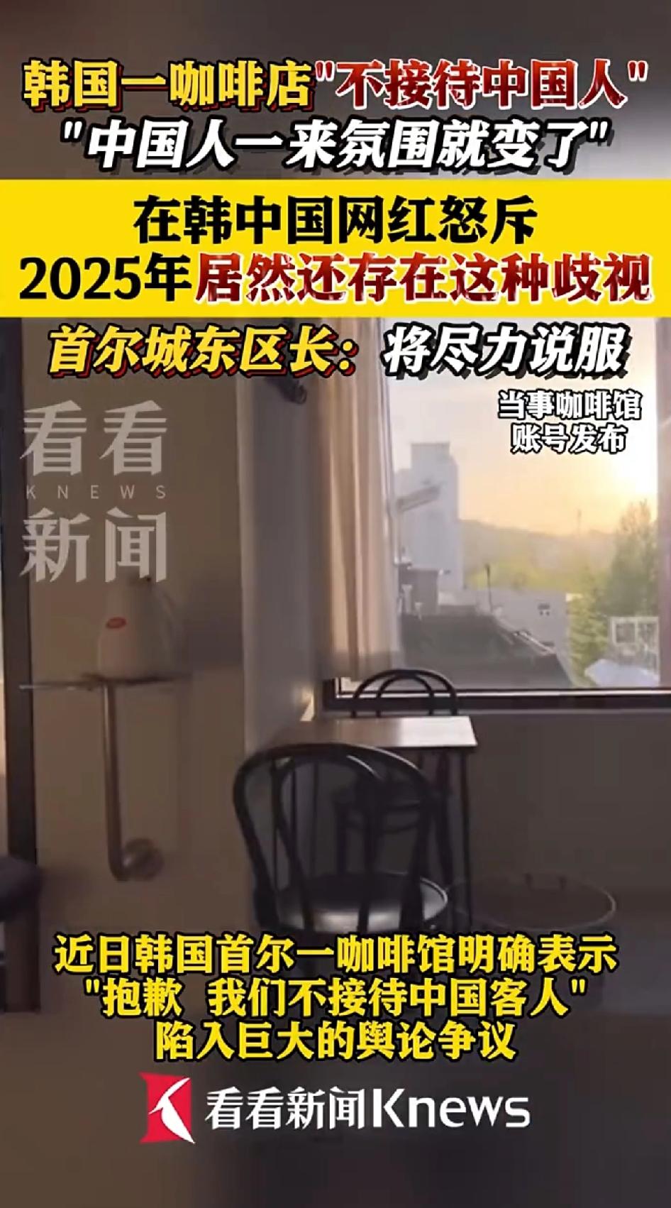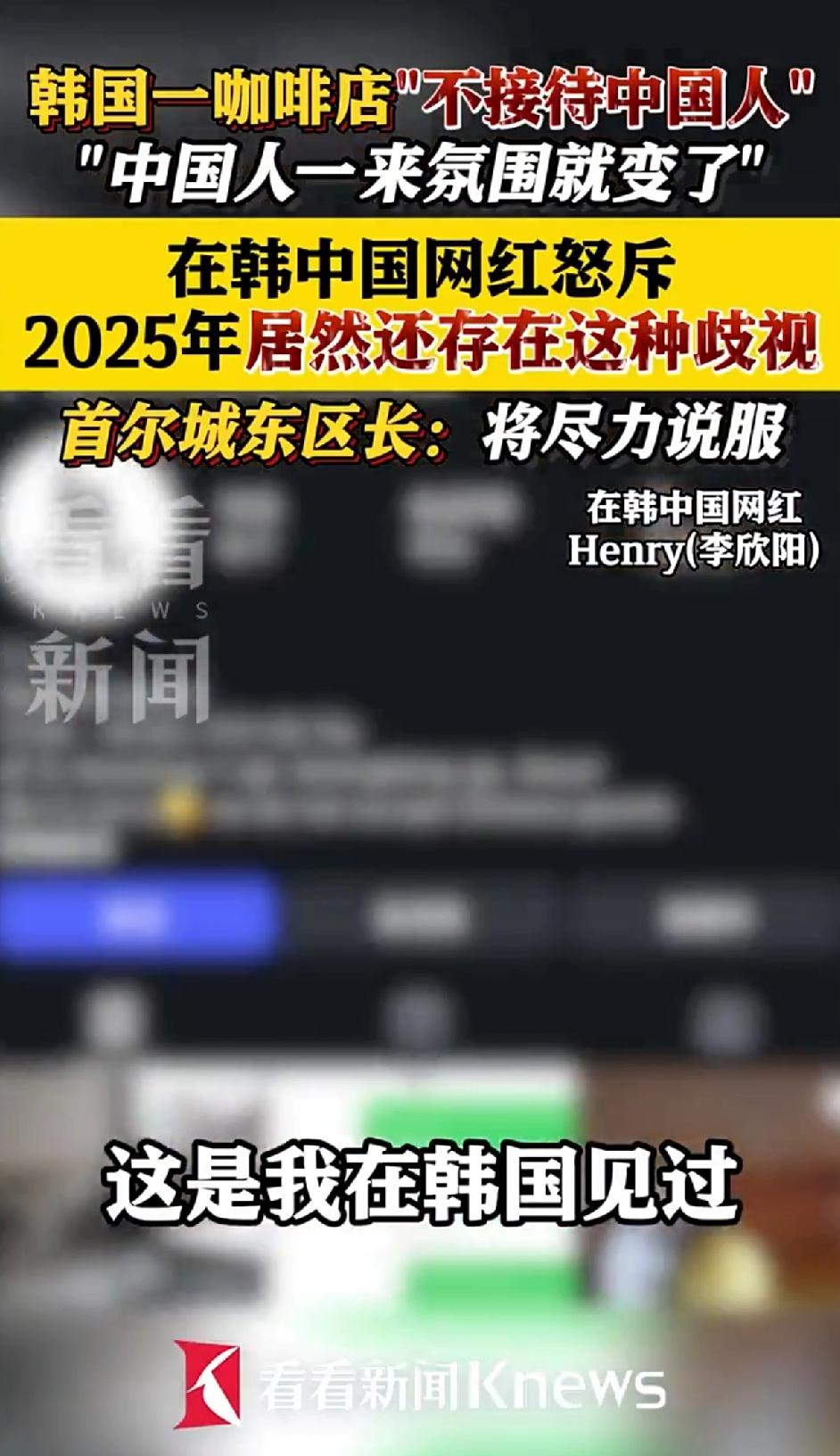 韩国一咖啡馆“不接待中国人” 中国人一来气氛就变了。 有长期居韩的中国网友去打卡,就因为讲中文被店主赶了出来。 这店之前还是网红店,店主后来在社媒简介里明确写着不接待中国顾客,还称“这就是我”,限制网友评论,态度嚣张得很。 之前济州岛也有咖啡馆贴中文提示“请按价付费”,韩媒报道是因为部分中国游客有随地便溺、不付费等不当行为。 韩国人来中国蹭吃蹭喝的那算什么行为?来中国旅游的韩国人小气巴啦的,我们都没有歧视他们。 他们倒好先歧视我们了!哪里都有的好人和坏人,不能一概而论吧?一竿子否定所有人。 但个别行为不该让所有中国人背锅,这家咖啡馆直接搞歧视,实在不地道,去韩国旅游的咱直接避雷!