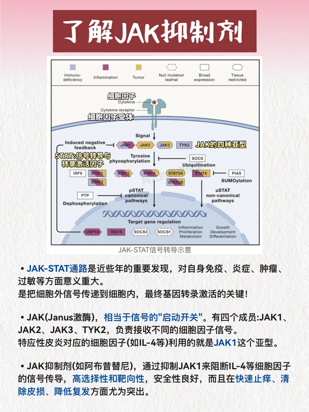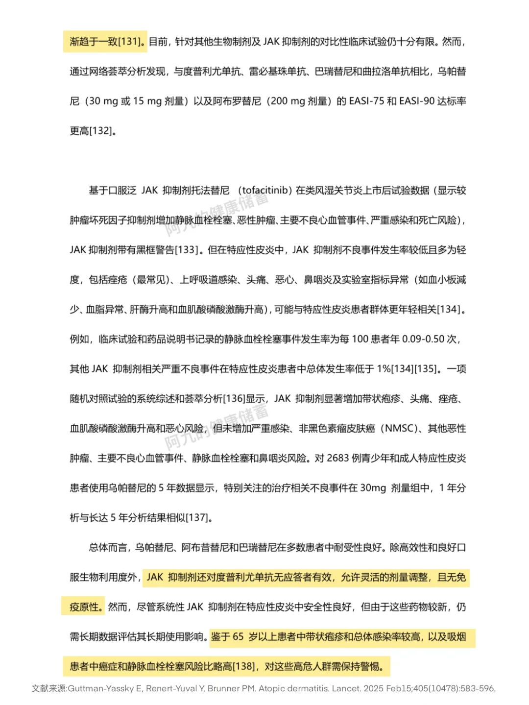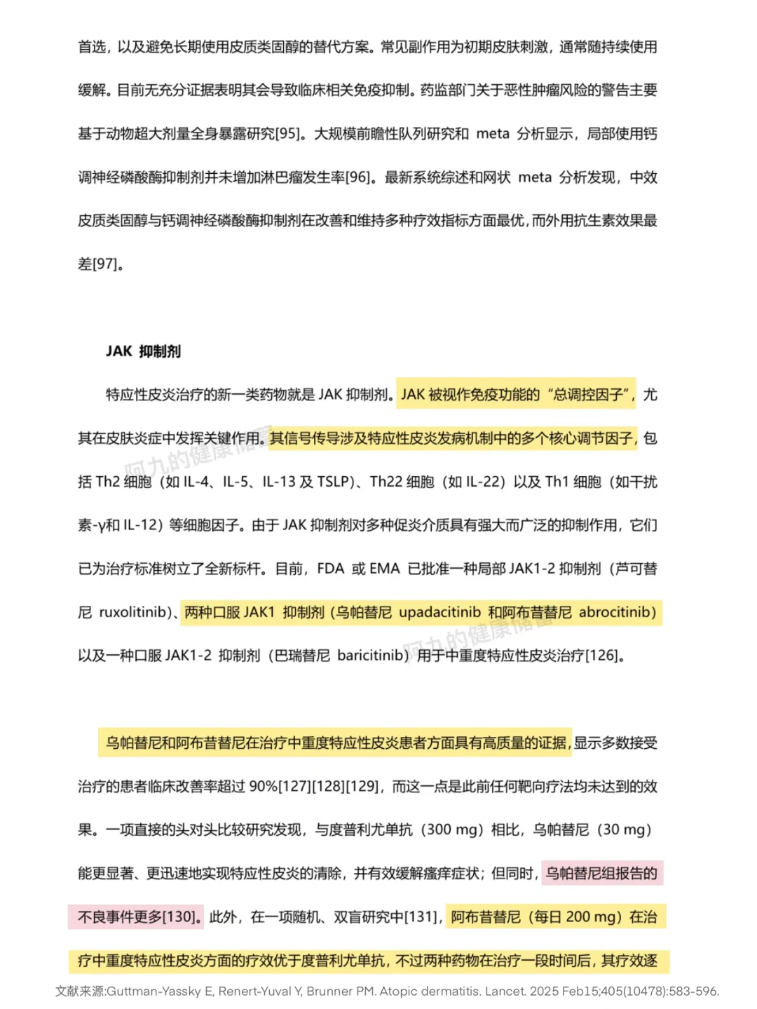▫️口服药与生物制剂:中重度特应性皮炎患者可考虑JAK抑制剂(如阿布昔替尼,它是高选择性JAK1抑制剂,安全性良好,能够快速强效止痒、强效清除皮损、持久控制与降低复发)。尤其是对生物制剂应答不佳或不耐受,是一种新型的治疗方式,可降低复发频次,对AD是新的选择。