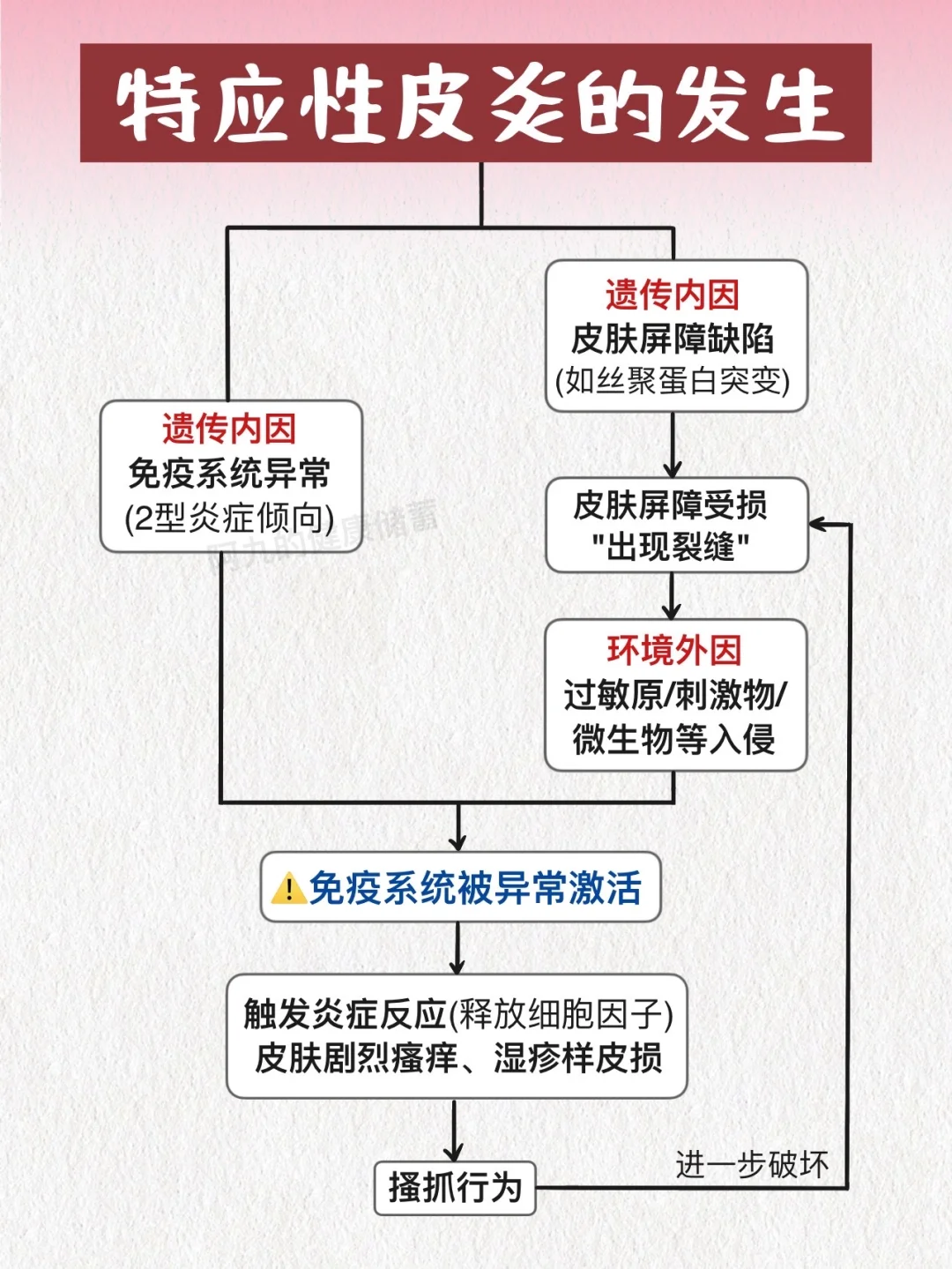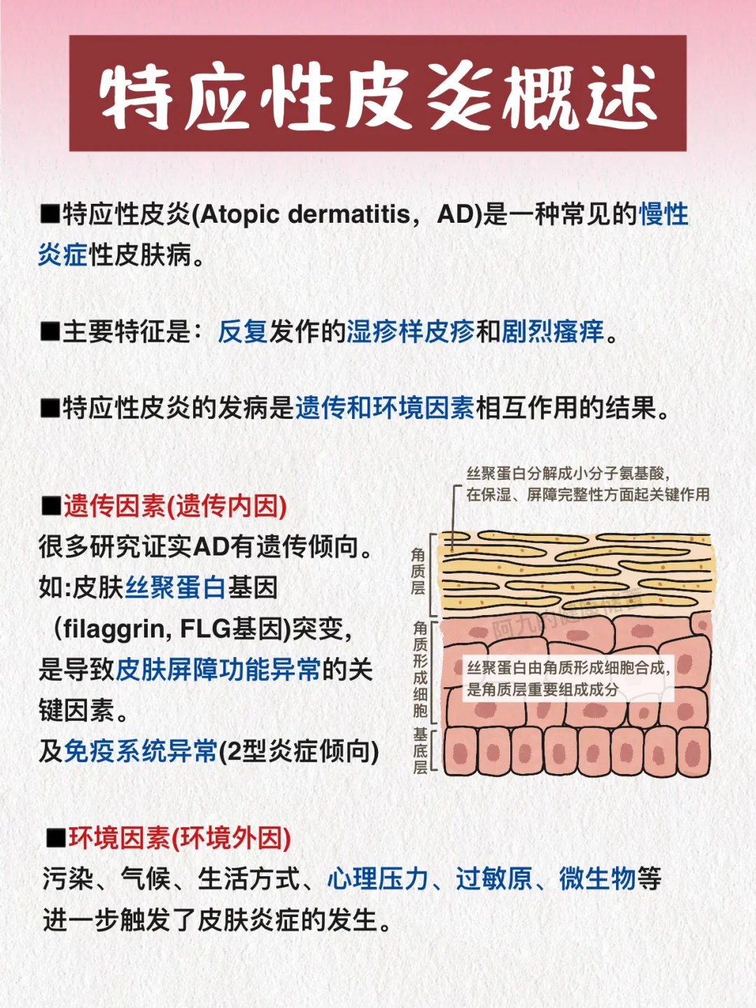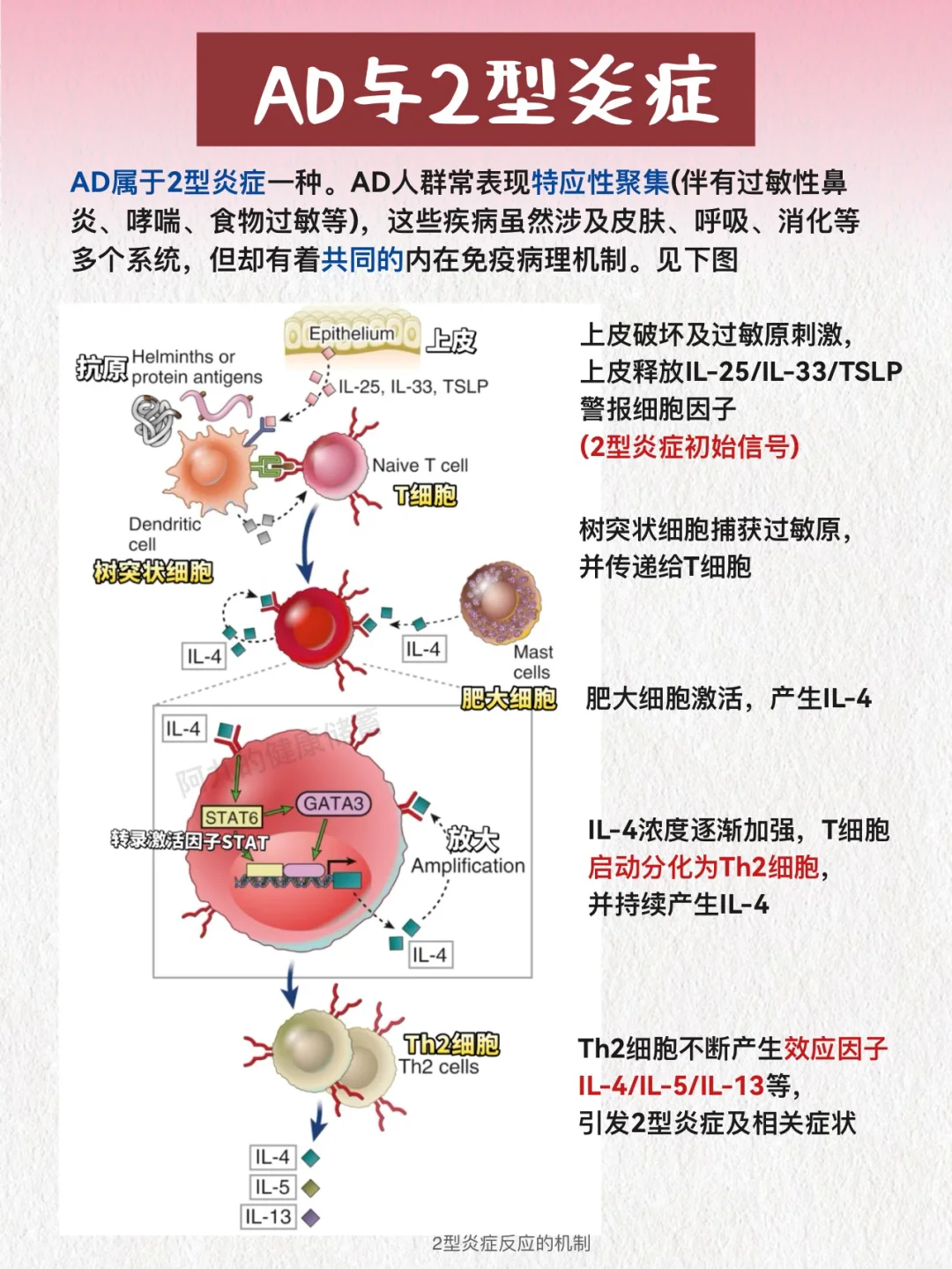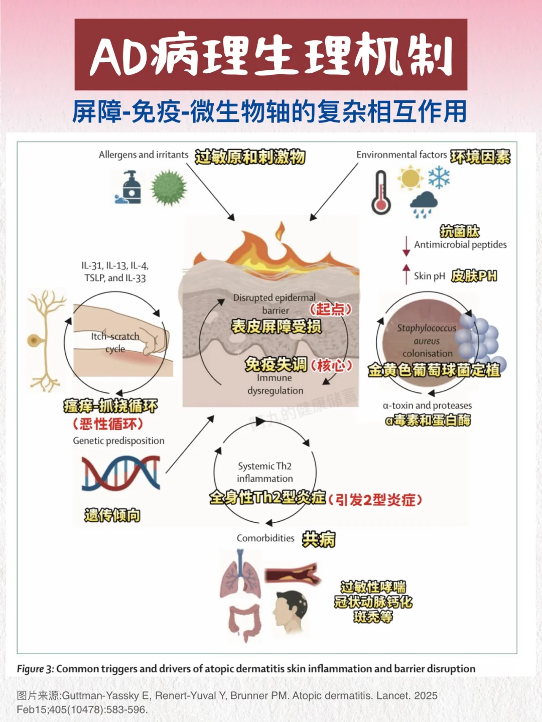 简单来说,AD是皮肤屏障先天不足(比如丝聚蛋白基因突变)+免疫系统过度敏感(2型炎症)共同作用的结果。皮肤像“裂开的墙”,外界刺激物、过敏原轻易入侵,引发剧烈瘙痒和反复皮疹。很多人从小就有,可能伴随过敏性鼻炎、哮喘等,这就是特应性聚集
