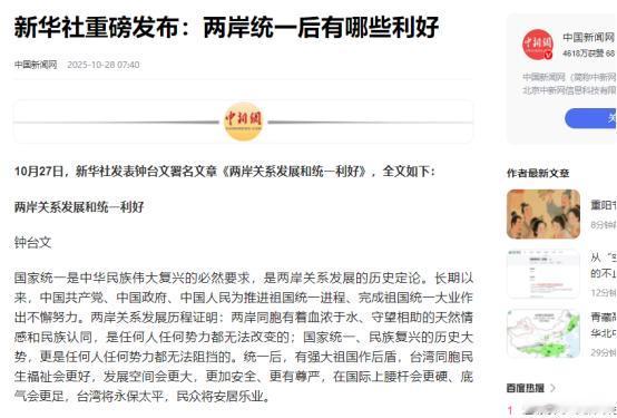 公开条件了!昨晚台湾省注定是一个不眠之夜! 10月27日新华社以钟台文署名公开发文,核心思想有五大点,已经在明示台胞们回顾后可获得哪些权益,然而评论区的网友也没有放松思考:统一不是由台湾人说了算,而是由14亿中国人说了算! 台办文章列出的权益,一看便是“统一后可期待”的范本,统一之后,尊重台湾同胞的生活方式,并保障其合法权益;台湾将分享国家发展红利,助力突破经济发展瓶颈。 现在台湾不少工厂都在搞“做四休三”,有的甚至快撑不下去要关门,制造业PMI连续好几个月都在收缩区间,老百姓对收入前景越来越没底。 统一之后完全不一样,台湾商品进大陆能享受到零关税待遇,企业不用再怕美国关税的折腾。像集成电路、精密机械这些台湾的优势产业,能和大陆的产业好好互补,一起做全球的生意,那些“无薪假”的困扰自然就少了。 更实在的是台湾同胞的日子会过得更踏实,统一之后,台湾现行的社会制度和生活方式都会被充分尊重,私人财产、宗教信仰这些合法权益,全都有保障。 爱台爱乡的感情也不会被辜负,大家能真正当家做主,不用再被岛内的政治争斗牵着走。之前大陆出台的“31条措施”“农林22条措施”已经让不少台胞尝到了甜头,统一后这些利好只会更多。 经济好了还不够,老百姓的钱袋子和生活质量才是根本。统一之后,台湾的财政收入能真正用在民生上。现在那些花在“台独”上的防务预算,到时候可以大量投进医疗、教育和养老领域。 台澎金马的高速公路、高铁这些基础设施,国家会帮忙改善。两岸的医疗、教育资源能共享,以前困扰大家的民生难题,都能找到解决办法。两岸商品无障碍流通后,台湾市场上的消费品价格会降下来,老百姓买东西能更实惠。 台湾同胞还能共享民族的荣耀,这是花钱都买不来的。以前在国际上,台湾同胞总少点底气。统一之后就不一样了,大家能以主人翁的身份参与国际事务和全球治理,真正体会到大国公民的尊严。 经中央政府批准,外国可以在台湾设领事机构,国际组织也能在这设办事机构,相关的国际会议都能在台湾举办。这种腰杆硬起来的感觉,只有强大的祖国能给。 最关键的一点,统一之后就能彻底远离战争风险。现在民进党当局勾连外部势力,把台湾往兵凶战危的路上推,大家心里都发慌。 统一之后,“台独”带来的战争隐患会被清除,外部势力干涉两岸事务的黑手会被斩断。两岸同胞能在和平的环境里工作生活,不用再担心动荡,踏踏实实过日子。 就像网友说的,统一不是由台湾人说了算,而是由14亿中国人说了算。钟台文这篇文章把权益讲得明明白白,就是想让台胞们看清,统一是真真切切为了大家好。两岸本来就是一家人,统一之后台湾会更好,这是任何人都挡不住的大势。 来源:中国新闻网 【新华社重磅发布:两岸统一后有哪些利好】