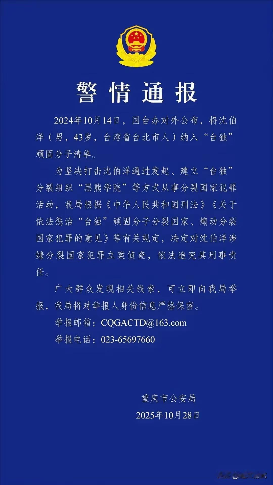 谁说大陆对台独迫害高安国将军之事无动于衷?今天,雷霆第一击来了。 臭名昭著的台独黑熊学院院长,罗织罪名迫害高安国将军的元凶——沈伯洋今天被大陆警方以分裂国家罪刑事立案。 沈伯洋勾结美国反华势力,甘当台独马前卒,迫害岛内统派人士的罪证,相信大陆警方都已掌握在案,后面就是对其缺席判决,全球通缉。 网友:直接从台湾秘密抓捕几个死硬台独分子到大陆受审然后枪毙好过千言万语。可以学以色列摩萨得,派遣一只精干小队前往台湾把这厮抓捕归案[发怒]然后公开审判! 还有欺压迫害高将军他们的台湾警察局,检察院,法院和监狱的台独分子们也要严惩不贷。 中国大陆警情通报台独分子沈伯洋,如果能抓捕并绳之以法,那将是对台独分子的打击将如釜底抽薪,愿早日看到这一天。