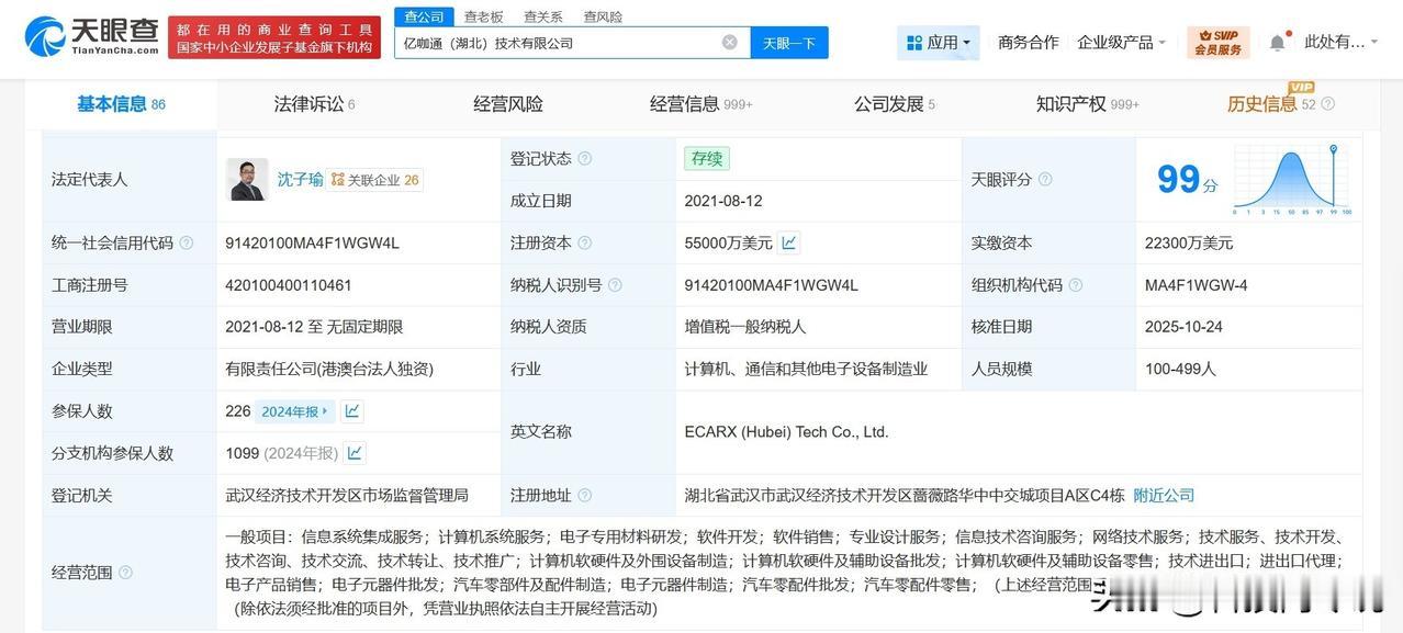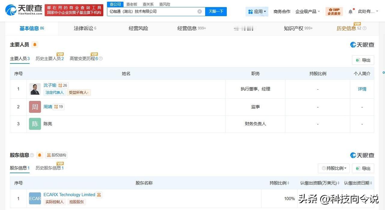 【亿咖通湖北公司增资至5.5亿美元 增幅约83%】 天眼查工商信息显示,近日,亿咖通(湖北)技术有限公司发生工商变更,注册资本由3亿美元增至5.5亿美元,增幅约83%,同时,财务负责人由熊芳婷变更为陈亮。 该公司成立于2021年8月,法定代表人为沈子瑜,经营范围含信息系统集成服务、计算机系统服务、电子专用材料研发、软件开发、专业设计服务、信息技术咨询服务、网络技术服务、汽车零部件及配件制造、电子元器件制造等。股东信息显示,该公司由ECARX Technology Limited全资持股。 天眼查信息: