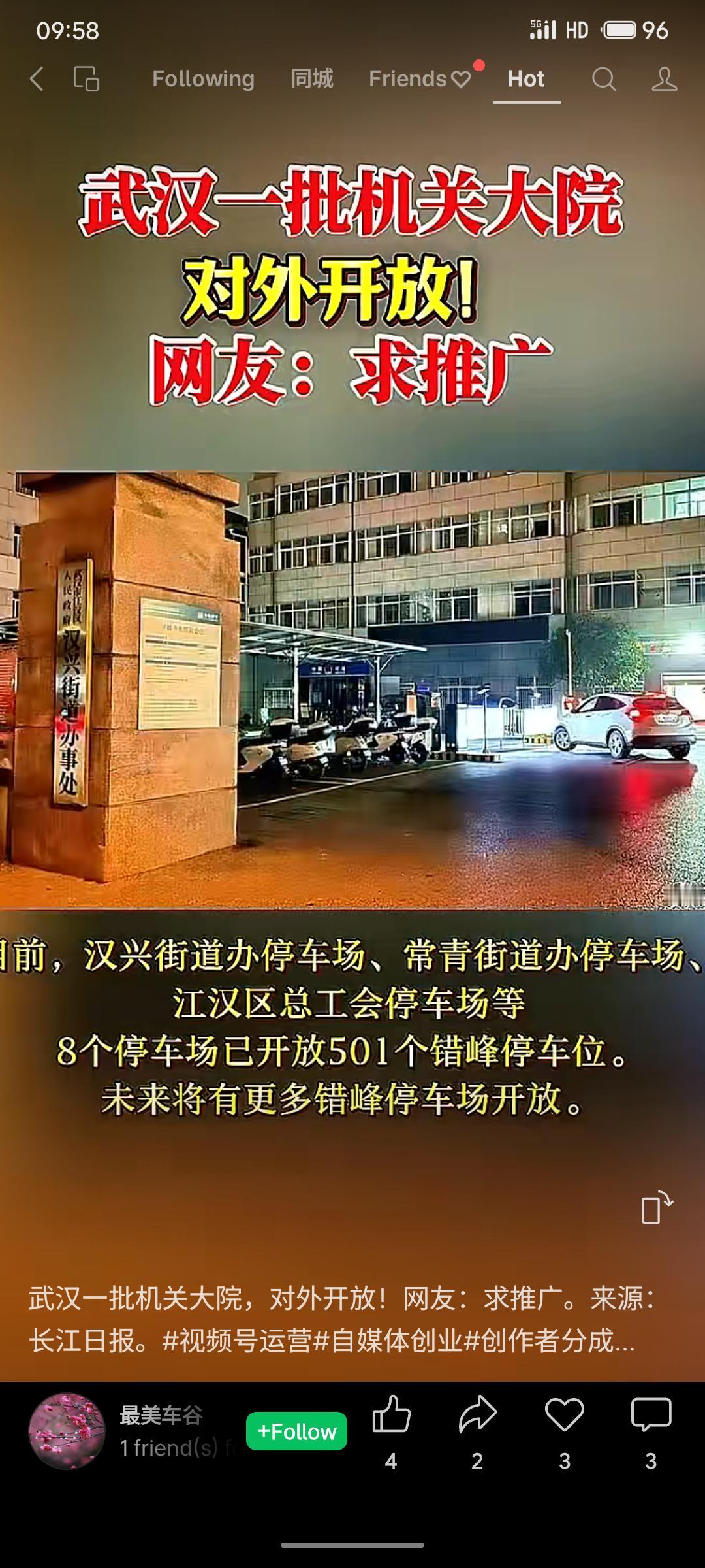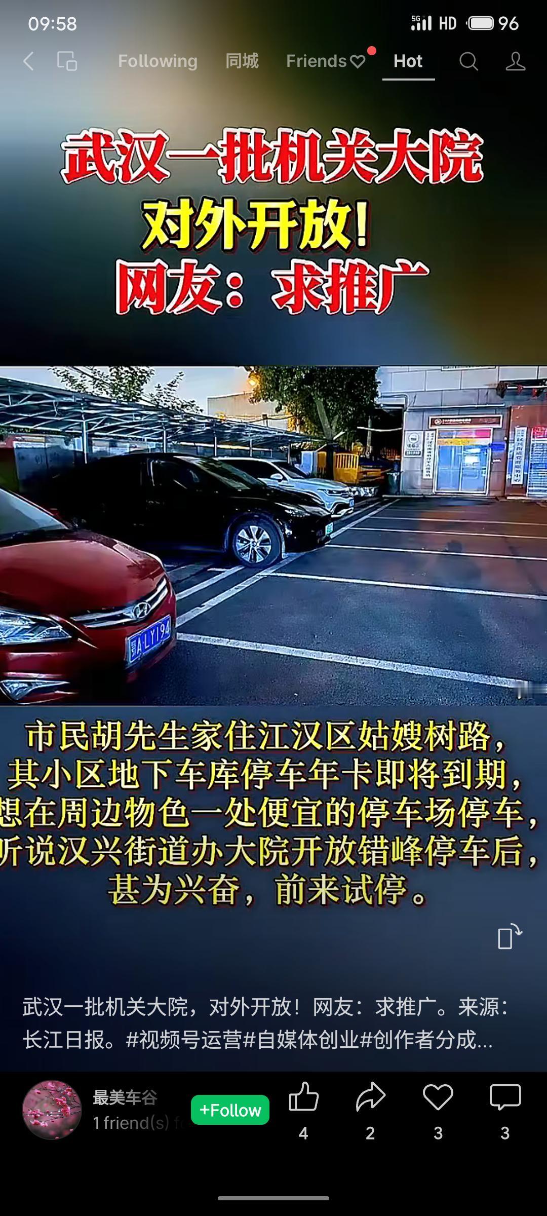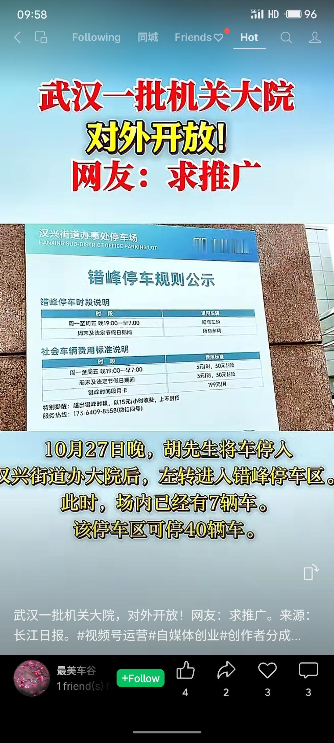 武汉市首批机关大院错峰开放内部停车场,包括汉兴街道办等8个场地提供501个车位。工作日夜间及非工作日向居民开放,月卡99元。此举有效缓解周边停车难题,获市民好评并期待推广。
