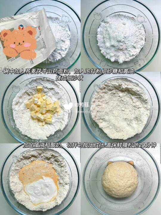 ⊳荞麦茯苓山药面粉(或低粉)300克 | 无铝泡打粉6克 | 黄油80克 | 砂糖30克 | 鸡蛋一个 | 酸奶150克