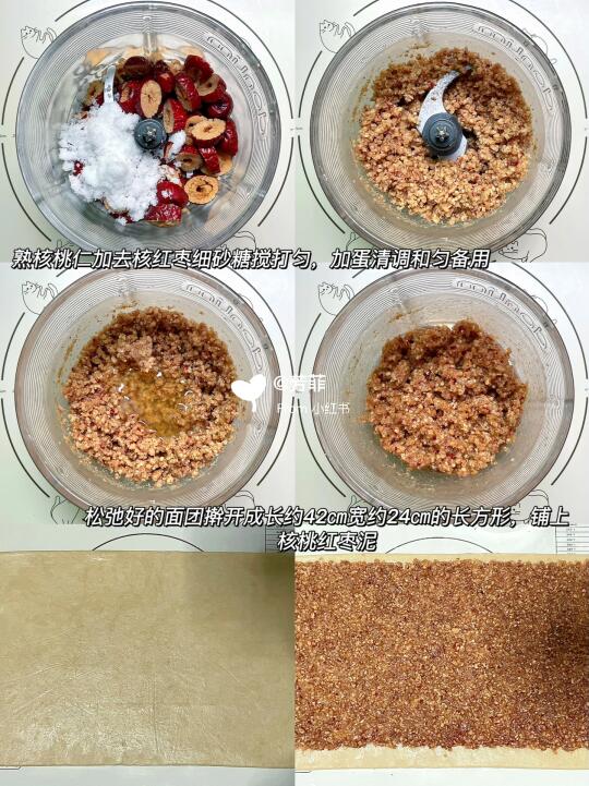 3️⃣熟核桃仁和去核红枣加砂糖放料理机搅碎,加适量蛋清调匀备用