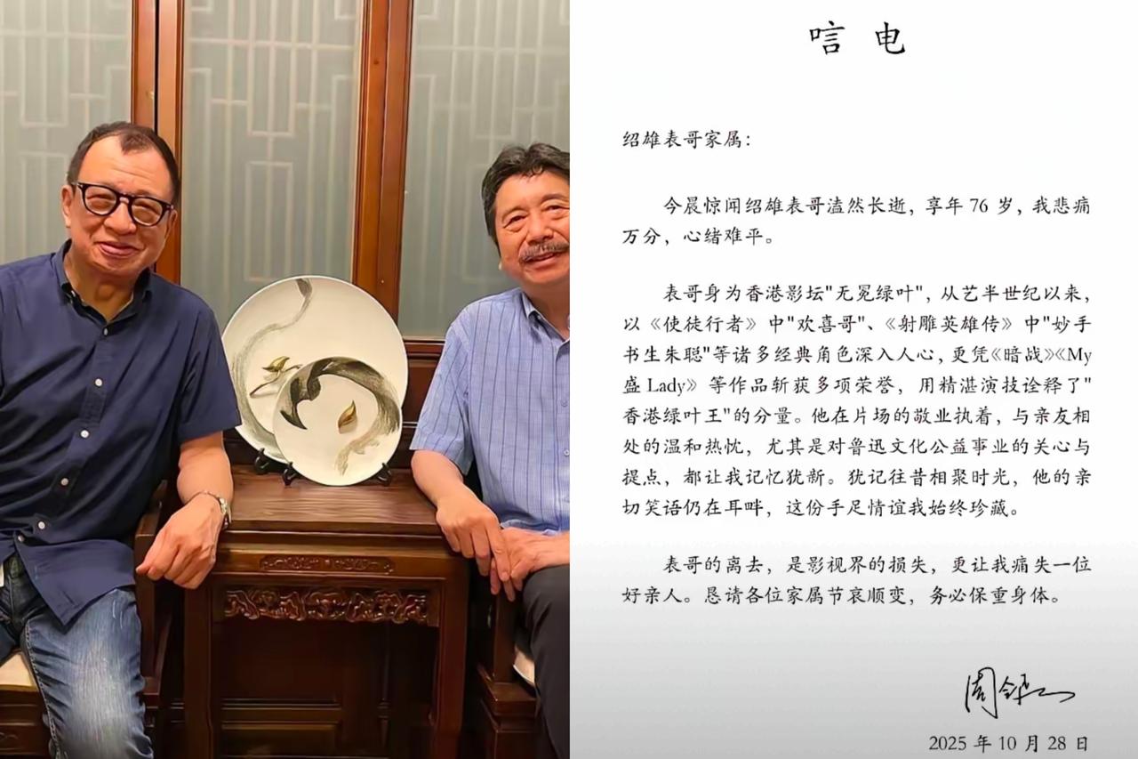 许绍雄跟自己姑奶奶家的表弟, 鲁迅的亲孙子周令飞相认的时候已经是2021年了, 不是两人不想见面,是许绍雄去的时候恰巧周令飞都不在。 直到许绍雄离世,周令飞那篇有祖父文风的悼文曝光,这段藏了多年的亲戚关系才又被提起——可他俩2021年才真正相认,之前总因为“你不在”“我错过”完美错过。 说起来这俩人的人生,简直是“叛逆”的两种打开方式。许绍雄不愿继承家业,一头扎进演艺圈在香港拍戏讨生活,自嘲是“枯枝乞儿”;周令飞更绝,79年跑去日本留学,跟台湾妻子结婚后摆摊卖爆米花,连父亲都气到要断绝关系,后来他说“受不了被按爷爷的路子活”,才拼命逃。 如今许绍雄走了,再看这对表兄弟,一个踏实讨生活,一个挣脱束缚活,却都在各自的选择里活出了滋味。你觉得,比起“名人后代”的标签,他俩这样“不按剧本活”,是不是更难得?许绍雄 鲁迅 你看过许绍雄演的哪部剧