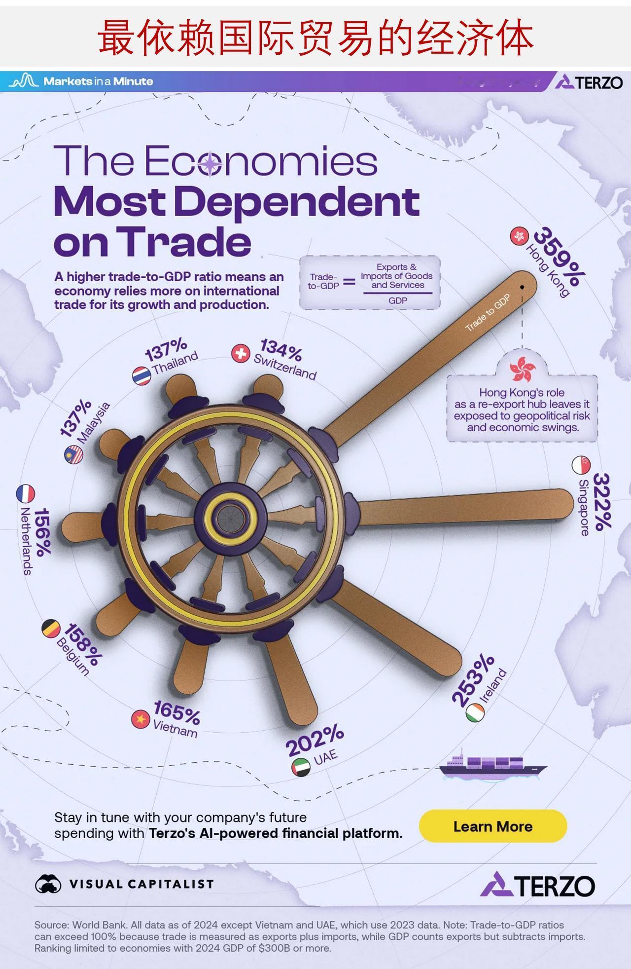 最依赖国际贸易的经济体是哪些? 由于关税政策的影响,这场贸易战已经对 2025 年的经济关系造成了威胁。那么,在这些国际贸易的变动中,哪些经济体受到的影响最为严重呢? 这张图表是探讨了哪些国家和地区在经济发展中对贸易的依赖程度最高。 ——最大的国际贸易依存度 测量一个经济体对国际贸易依赖程度的一个关键指标是贸易与国内生产总值的比率。该比率是该国货物和服务进出口总额除以其国内生产总值所得的商数。 重要的是,较高的比率意味着一个国家(地区)的增长、生产以及价值链与全球贸易流动的联系更为紧密。因此,关税的变化和贸易争端可能会产生更大的影响。 香港的这一比例高达 350%以上,这意味着通过该地区的贸易量是其经济规模的三倍多。由于实行自由贸易政策,香港成为了货物再出口的枢纽,尤其在与中国大陆以及世界其他地区之间发挥着重要作用。 新加坡在国际贸易依存度方面排名第二。该国优越的地理位置、强大的物流基础设施以及与全球市场的紧密联系,使其成为了重要的贸易枢纽。 说到美国的关税政策,一些依赖贸易的国家所受到的冲击要比其他国家更为严重。来自越南、泰国和瑞士的进口商品都将为美国带来丰厚的关税收入。 ——应对贸易战 鉴于这些经济体高度依赖地缘政治变化和关税,它们打算如何保持自身的韧性? 行业专家表示,香港必须从一个单纯的转口贸易中心转型为供应链服务管理中心,为此需在金融、法律和保险等领域提供支持。在贸易战背景下,香港还计划加强其机场基础设施建设,以作为另一项竞争优势。 与此同时,爱尔兰正试图通过向企业发放补贴及其他形式的支持,来缓解美国的关税影响,以便企业能够探索美国以外的新市场机遇。