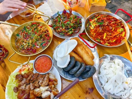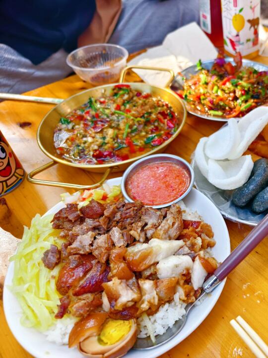 我们点了招牌鸡脚、猪脚饭、油呛三合一、舂螺肉,还有傣族粑粑三拼,都没有踩雷,适合口味重的uu们。