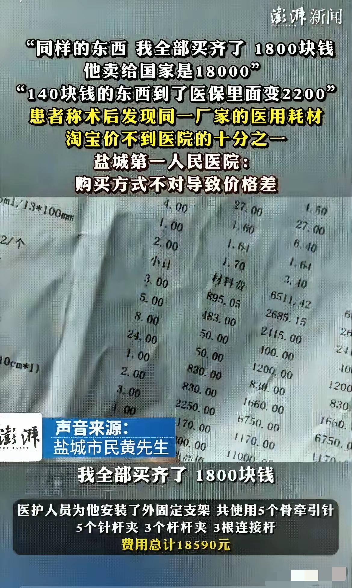 刷医保的糊涂账,这次真的忍不了!江苏盐城黄先生的遭遇,简直戳中了所有人的痛处。 骨折手术用的针杆夹,网上同款168元,医院医保价直接飙到2200元,差了十几倍。找医院要说法,人家甩一句“购买渠道不对”,还说价格是医保局定的,自己没权改。 可投诉后,价格又悄悄降到895元,更离谱的是器械商还上门塞红包让闭嘴。 所谓的“阳光采购”,阳光到底照在哪了?就算医院有存储、消毒成本,也不能翻十倍涨价吧。 我们交医保是求个看病兜底,不是给不明不白的差价买单。真要透明,就把采购价目表全晒出来,让每一分钱都明明白白。