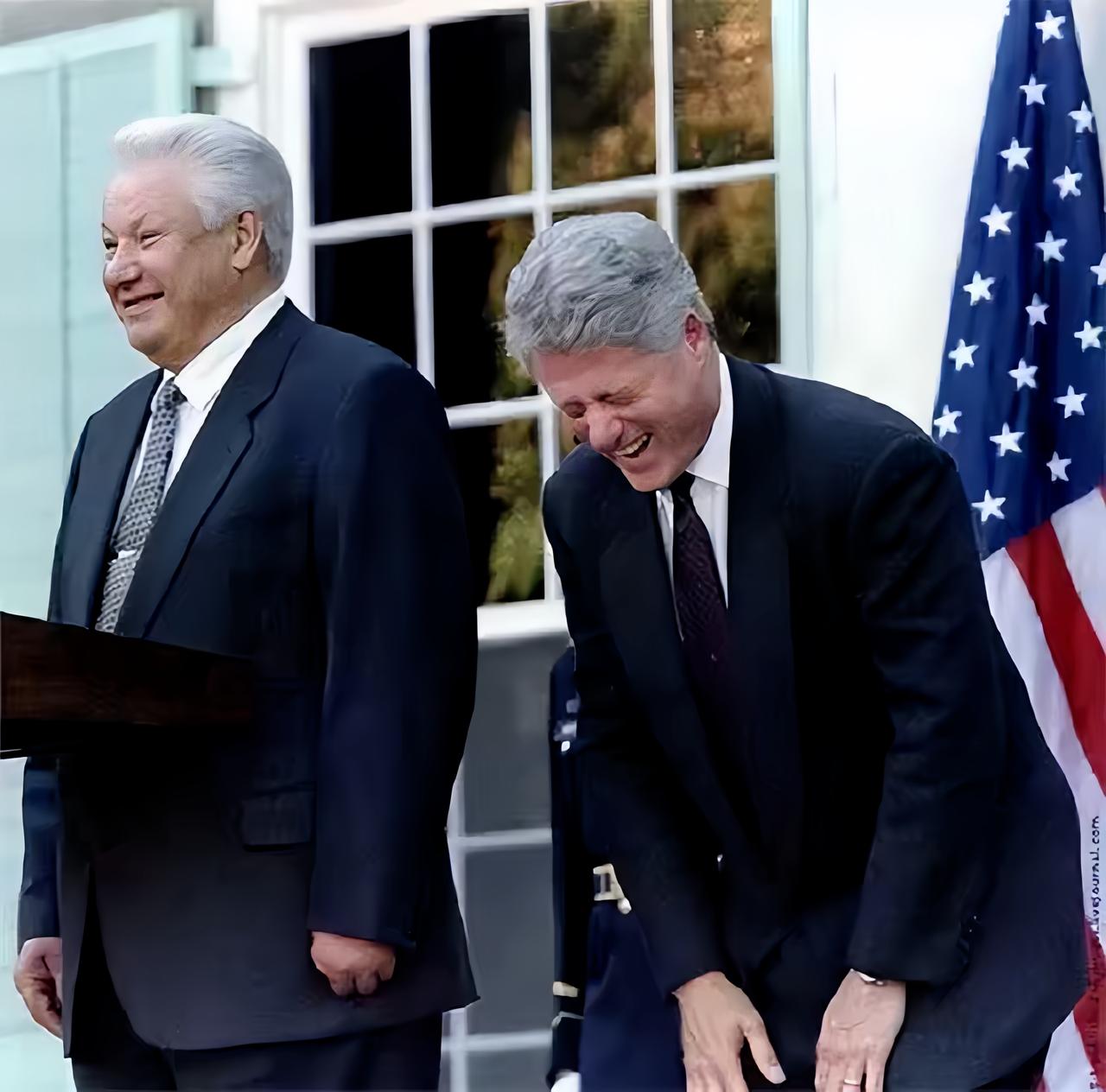 下图是历史上一张最有名的抓拍照,时间是1995年10月23日,地点是美国纽约海德公园。当时叶利钦正与克林顿在举行记者会。 从照片可看出,记者会上,时任美国总统的克林顿当众笑得前仰后合。实际视频记录中,克林顿爆笑了一分钟,几乎笑到完全失控。 这张照片被后世解读为:美国忽悠苏联解体后,忍不住得意狂笑。很多人认为:克林顿实在是应该笑,曾经的对手不仅自残,而且还跑过来拍自己的马屁,这种好事,发生在谁身上都得大笑庆贺。 这张照片里,克林顿的大笑,实际源于翻译错误,然而,不管其大笑源头是啥,他的笑里,确实包含“庆贺”意味。请看当时的具体情况还原—— 会上,有记者预测美国和俄罗斯会在波斯尼亚问题上存在分歧,所以认为这场美俄首脑峰会将是灾难。叶利钦当即做了回应,可他的英文翻译却翻译出错了,叶利钦的原话是:“记者的想法是错误的”,翻译却翻译成了“这个记者是个灾难”。 克林顿听了,误以为叶利钦是在嘲讽记者,因为美国文化里,他们经常会幽默地进行回应。克林顿显然在用他的脑回路揣测叶利钦,于是开始哈哈大笑,大笑时,他心里八成有想:“叶利钦这么快就学会我们美国的幽默了,这是铁了心要跟美国混了,他怎么这么天真。” 而台下的人也都跟着哄堂大笑,他们多少将叶利钦看成了小丑:他居然为了彻底融入美国,把自己大卸八块,然后还模仿起美国的幽默来了,我们逗他呢,他居然当真了。 叶利钦根本没搞清楚他们为什么笑,因为他认为自己说的话并不搞笑,所以,他只能尴尬地赔笑。另一方面,他觉得要彻底融入西方,就得融入他们。于是,为了彻底融入,这之后,叶利钦的语言变得更加幽默了,他真的努力让自己的语言幽默起来,想继续逗大家笑。 后来,他还自以为轻松幽默地突然鼓掌,结果果然引得哄堂大笑。 叶利钦和克林顿的这张照片,如今仍被认为是20世纪最值得玩味的照片之一。然而,在玩味之余,我认为它带给人的启发意义是非常大的。它启示我们:任何时候,都不要向美国投降,真的太惨了。