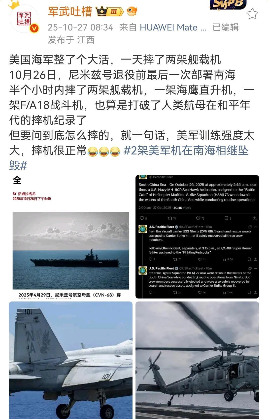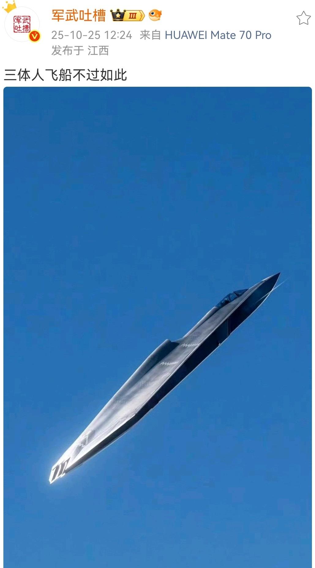东升西落,东边新机,西边坠机。 (图一)网友贴图,说是三体人的飞机都上天了,这造型到底是像一片叶子,或者一滴水滴? (图二)西边大国,一天坠了两架舰载飞机,一个是直升飞机,一个是战斗机,开创航母和平时期坠机新的记录。当然这可以解释为,训练强度太大,“平常多落机,战时少流血”,但听着不太对劲呀!