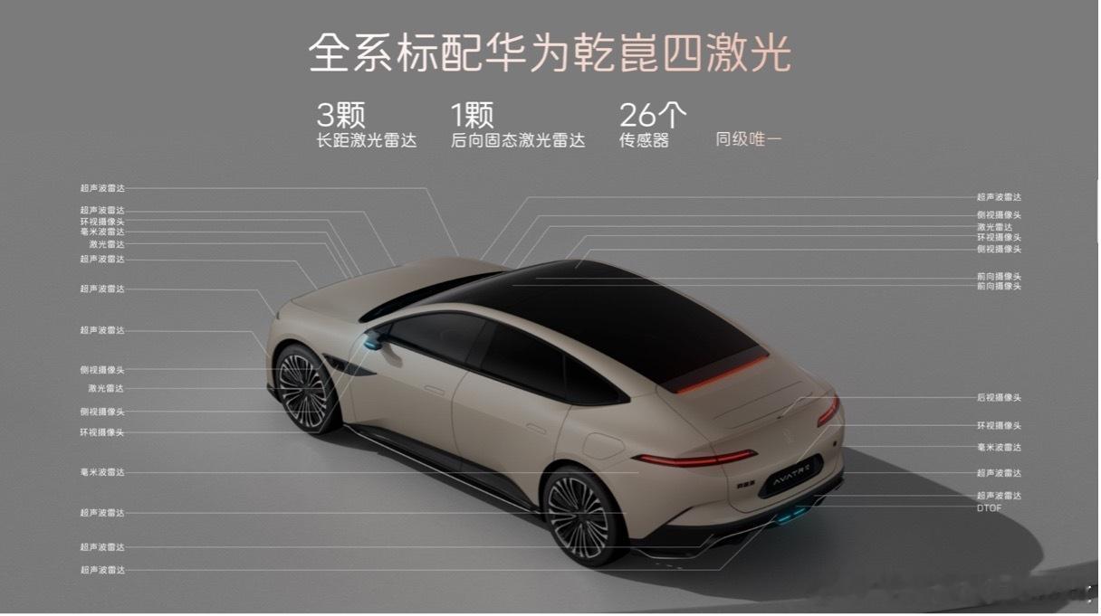 2、全系标配华为四激光雷达系统,包括3颗高感知长距激光雷达与1颗后向高精度固态激光雷达,采用基于WEWA技术架构的华为乾崑ADS 4