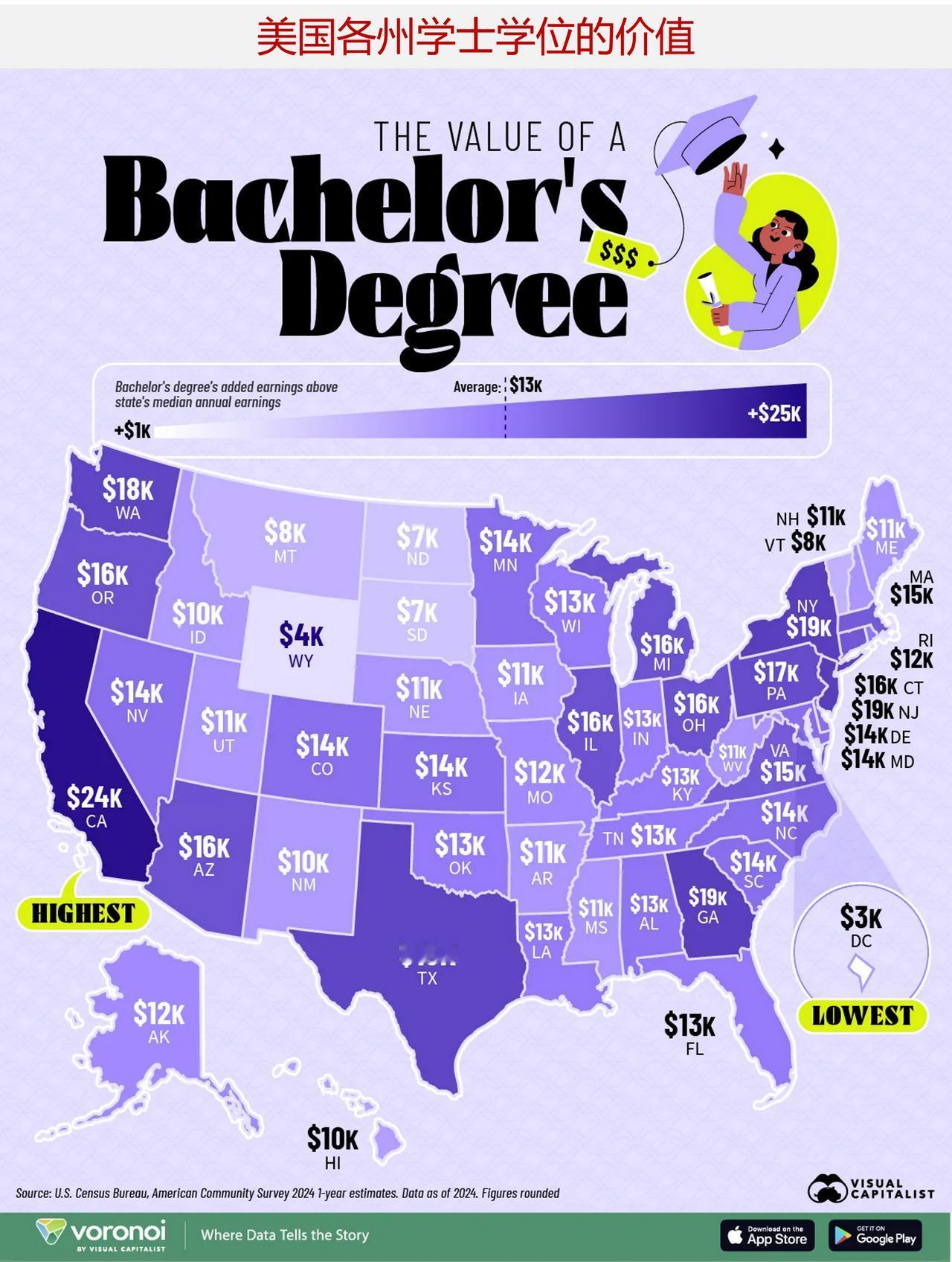 大学学位值钱吗?来看看美国各州的大学学位价值评估 大学学历通常被视为一种终身投资,但教育带来的经济回报不仅取决于所学的内容,还与居住地密切相关。 这张地图利用了美国人口普查局的数据,通过将拥有学士学位者的收入中位数与普通劳动者的收入中位数进行对比,来直观展示美国各州学士学位所具有的价值。 ——学士学位能带来最大收益的州 2025 年,拥有学士学位者在全美范围内的平均年收入约为 13000 美元,但各州之间的收益差异巨大。 加利福尼亚州的毕业生的收入比普通工人高出约 23732 美元,这一差距在全美范围内是最为显著的。其他收入较高的州还包括佐治亚州(19110 美元)、纽约州(18783 美元)和得克萨斯州(18084 美元)。 这些地区往往拥有大量与技术、金融和专业服务相关的工作岗位,而在这些领域,教育背景对薪资水平有着重要影响。 ——大学学位差距最小的州 而在另一端,有些州的大学毕业生与其他劳动者之间的收入差距并不大。 在华盛顿特区,获得学士学位的平均溢价仅为 3000 美元,这主要是因为该市较高的基础收入水平提高了所有职业的工资水平。实际上,华盛顿特区的学士学位持有者在全美范围内收入最高——年均收入超过 94000 美元——而且该地区在 2024 年的全美家庭收入中也位居最高水平。 同样,怀俄明州、北达科他州和南达科他州的学士学位的平均溢价均低于 7500 美元,这反映出这些地区的经济中存在大量蓝领工作岗位,而这些工作并不总是需要学历证书。